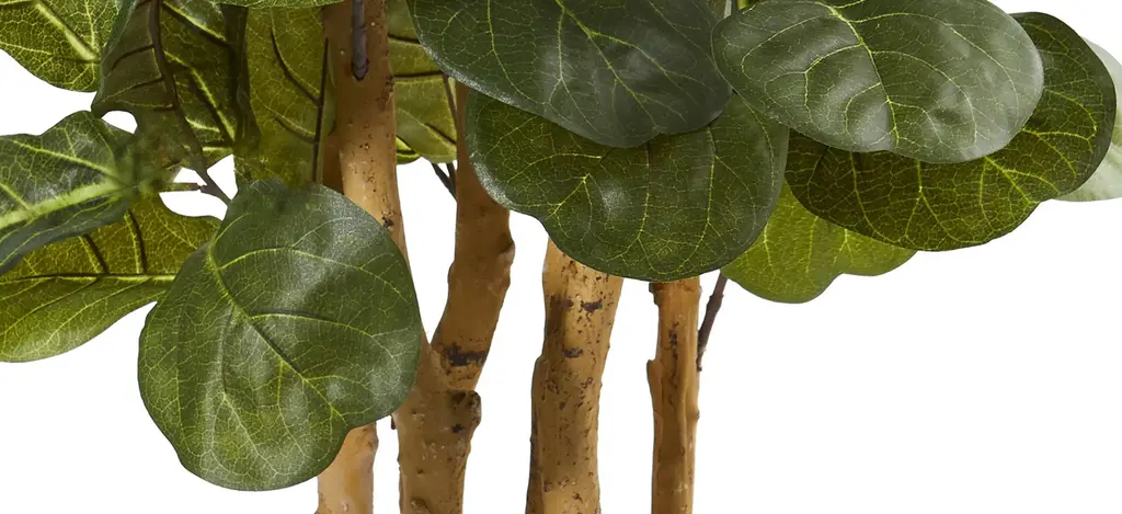 Several stems of this artificial 5 foot Fiddle Leaf Fig Artificial Tree reach upward, extending the rich, realistic green foliage toward the sky. The leaves are arranged to face several different directions in a natural way.