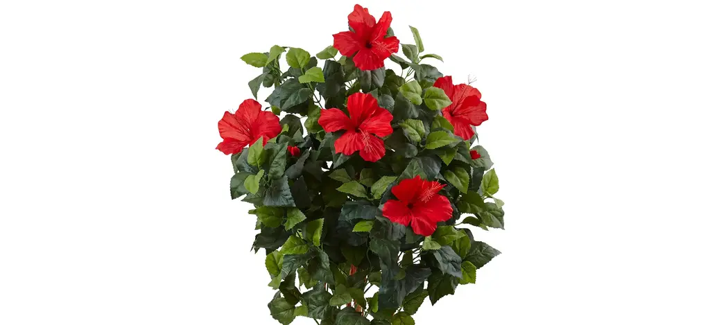 Bright red blooms and lush green leaves create the perfect complement to each other in this 5ft Hibiscus Artificial Tree in Decorated Wooden Planter. Ideal for any room you want to brighten up, this is a complete arrangement featuring a decorative wooden planter and natural moss.