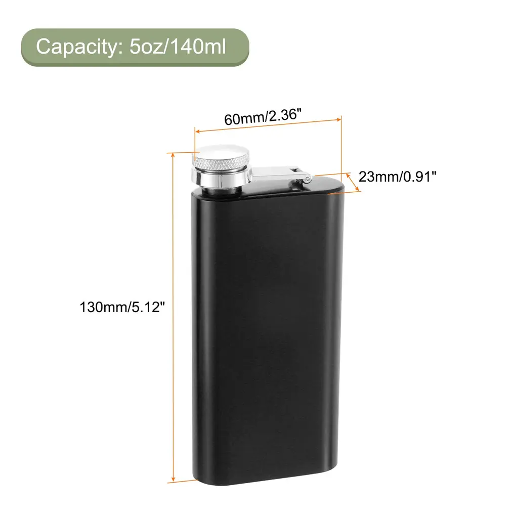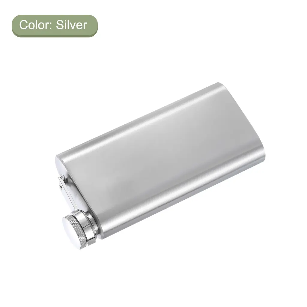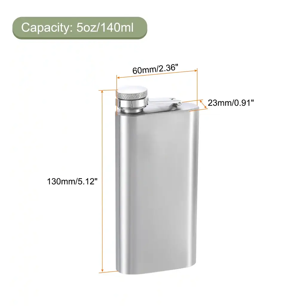 Description:Material - The hip flask is constructed from stainless steel material, with a plating surface finish for corrosion resistance, wear resistance, sturdy construction, not easy to rust and deform, and has long-lasting durability.Leak Proof - The cap of our hip flask is sealed tightly to ensure that wine or beverages will not leak out and be wasted. Furthermore, the cap features a hinged design which is connected to the flask, ensuring that they are not misplaced and lost.Easy to Carry - The shape of the flask is flat and rectangular, portable to carry out, allowing it to easily fit into pockets, bags, or hidden compartments. Store it anywhere, drink anytime and anywhere.Multifunctional Application - The portable hip flask can be brought while camping, fishing, picnic, boating, hiking and other outdoor or indoor activities to carry and store a small amount of liquor or other beverages.Warm Tips for First Use & Conservation - 1. Please rinse the flask inside with soap water and clean it up for the first time. 2. After using, please keep the flask always empty, clean and dry thoroughly when not used. 3. Better not to keep liquid in it for a long time.Specification:Material: Stainless SteelFinish: PlatingColor: SilverCapacity: 5oz/140mlOverall Size: 130 x 60 x 23mm/5.12" x 2.36" x 0.91"(L*W*T)Package Content:1pcs x Hip Flask