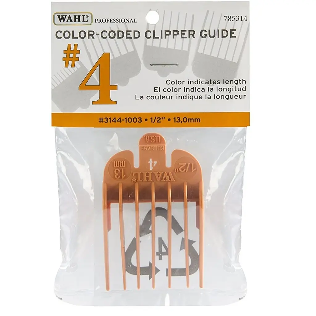 Five Wahl Color-Coded Clipper Guide #4 - 1/2" #3144-1003 The #4 Cutting Guide comes in Orange (3144-1003) and measures at a cutting length of 1/2". The Wahl Professional Cutting Guides fit all full-size Wahl Professional blades excluding the Competition Series and 5-in-1 Magic Blades.MPN:3144-1003x5UPC:043917314433