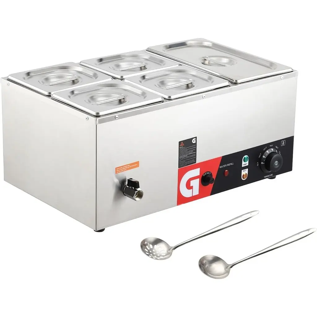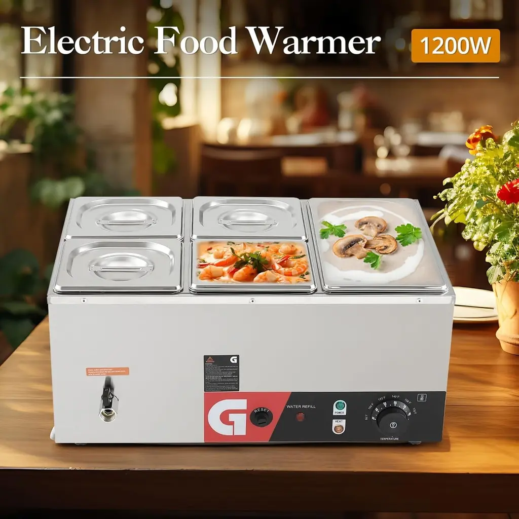 - **Precise Temperature Control**: Ensure your dishes are served at the perfect temperature with GarveeTech's advanced thermostat, offering precise control for consistent results. Ideal for maintaining the quality and taste of your food. - **Food-Grade Stainless Steel**: Crafted from high-quality, food-grade stainless steel, this commercial food warmer is durable, easy to clean, and safe for all types of food. Enjoy peace of mind with a product designed for health and longevity. - **Versatile Capacity**: Featuring a 6.3QT main compartment and four 2.6QT sections, this food warmer provides ample space to keep various dishes warm simultaneously. Perfect for catering events, buffets, and busy kitchens. - **User-Friendly Design**: Thoughtful features like anti-scald handles, a clear lid for visibility, and non-slip feet ensure safe and convenient operation. GarveeTech prioritizes your comfort and safety in every detail. - **Efficient and Reliable**: Built for commercial use, this food warmer combines efficiency with reliability, making it an essential tool for restaurants, hotels, and catering services. Trust GarveeTech for superior performance and durability.