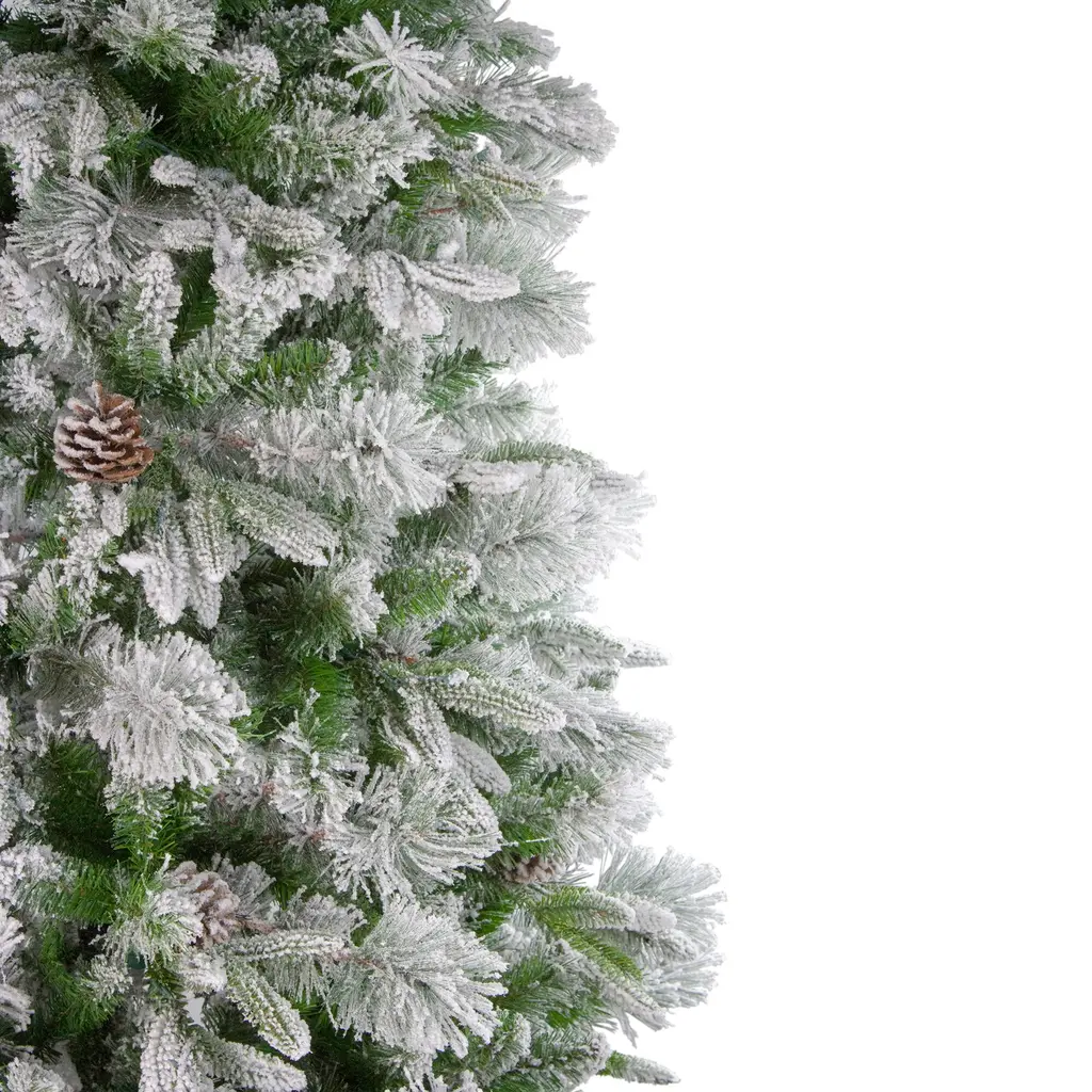 Our Flocked Rosemary Emerald Angel Pine series features a lush blend of life-like needles long needle pine and classic PVC foliage bringing the elegance of nature into your home this holiday season. The life-like needles give a realistic look and feel while the classic foliage provides fullness. The branches come lightly flocked mimicking a real tree in nature after a light snowfall. This beautiful series comes unlit simply leave as-is or add some lights and ornaments then enjoy! Product Features: Unlit. Flocked. 1066 tips. 30 pine cones. 1 and 1.5 inch wide tapered tips - 3 inch wide non tapered tips. Medium profile tree. Hinged branch construction. 3-piece easy assembly (including stand). Includes replacement bulbs and spare fuses. Comes with a FREE black metal tree stand. Tree ships in one box. Dimensions: 6.5' high (from the base of the stand to the top of the tree). 48" base diameter (at the widest point). Material(s): PVC/PE/metal. Note: Branches are compressed for shipment and need to be fluffed out upon arrival to look like the photo.