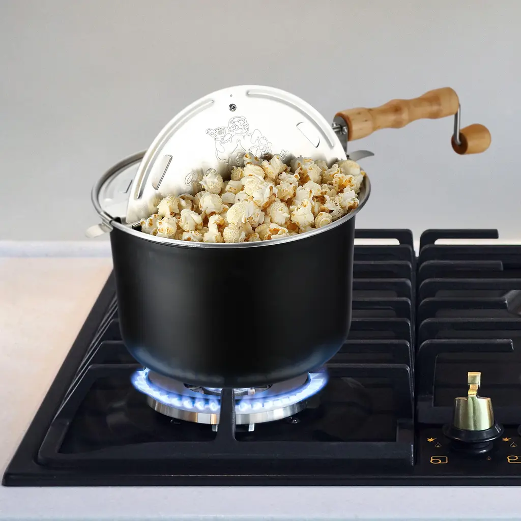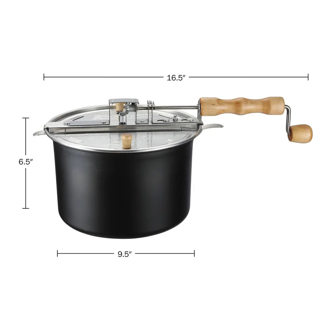 Easily prepare delicious fresh popcorn on your stovetop with the Pop Corn Maker by Great Northern Popcorn. The stove-top popcorn maker has an innovative design that allows moisture to escape during the popping process so your salty snack will be hot, crunchy, and mouth-watering. The stirring handle on the mini popcorn machine helps keep your treat from burning as you pop batch after batch. STOVE TOP POPCORN MAKER - This 6.5-quart stovetop popcorn popper can make up to 5 quarts of movie theater-style popcorn in just minutes, ideal for any family movie night, party, or game night. With a duplex heat pad, this popcorn pan ensures even cooking.STIRRING HANDLE - The old-fashioned popcorn maker features a wooden handle that remains cool while stirring, precision-made metal gears, and a built-in stir paddle that allows you to stir the popcorn constantly to prevent burning.MOISTURE RELEASE LID - The popcorn popper is equipped with a vented lid which allows moisture to escape for a fresh, crunchy, and delicious treat every time. The popcorn maker machine also has an easy-pour lid to prevent big messes.EASY TO CLEAN - This popcorn pot for stove top is made from durable aluminum with nonstick properties that make it easy to clean. Simply wipe the popcorn kettle out with a paper towel and store it for later use, with no water or soap required.PRODUCT DETAILS - Materials: Aluminum and Wood. Dimensions with Handle: (L) 16.5” x (W) 9.5” x (H) 6.5”. Note: Popcorn Pot does not Work on Induction Ranges. Color: Black.