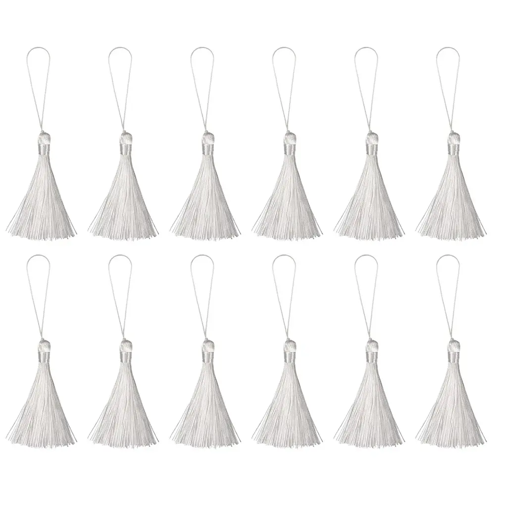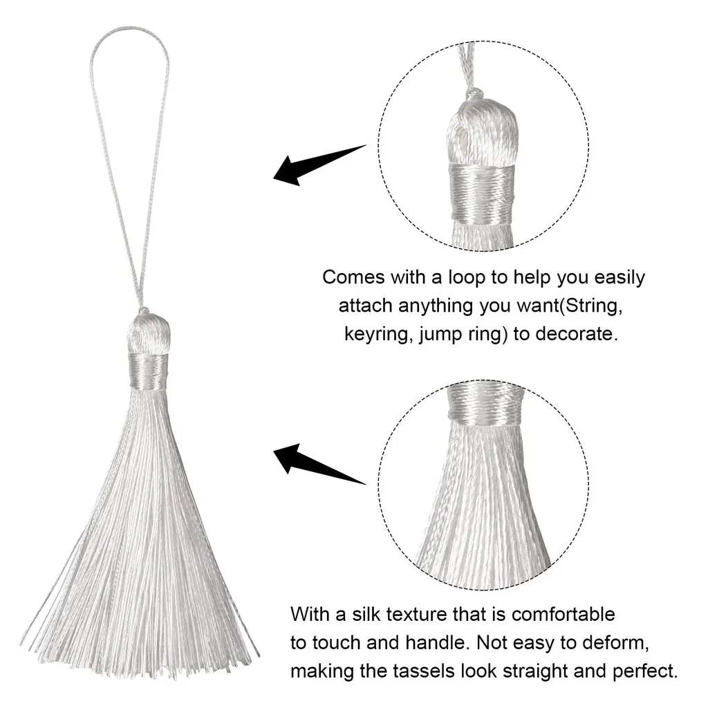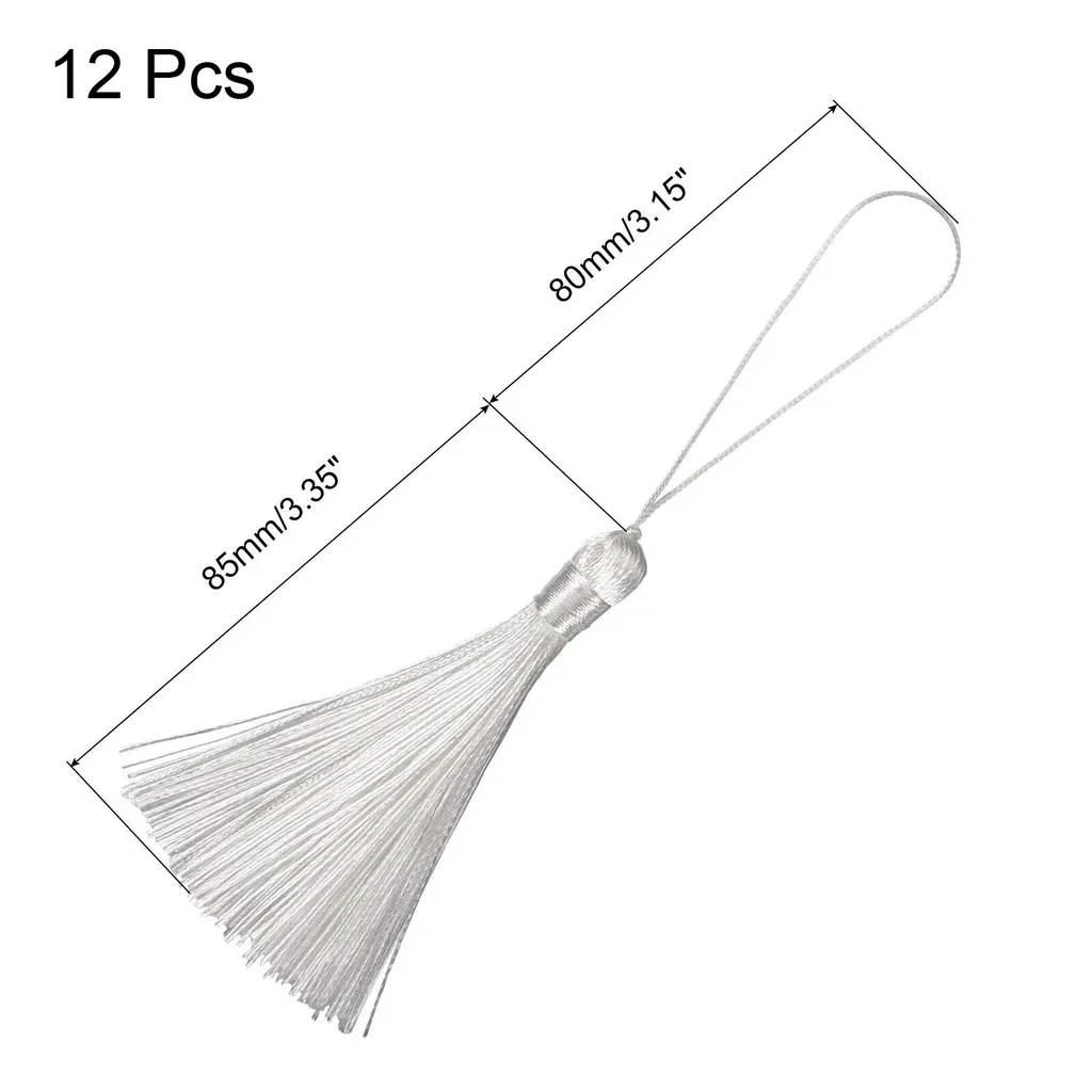 [Bookmark Tassels] - Total Size: 165mm x 10mm/6.5" x 0.39"(L*W); Tassel length: 85mm/3.35"; Loop Length: 80mm/3.15"; Color: White; Package Included: 12Pcs x Bookmark Tassels.[Material] - Made of polyester material that is sturdy and durable. It has excellent properties such as long-term use without ironing, wear resistance, non-deformation, high strength, and high elastic recovery.[Feature] - The tassel with a silky smooth texture that is comfortable to touch and handle. The tassel thread is tightly wound and not easy to fall off, so that the tassel hang high and looks straight and perfect.[Easy to Use] - Designed with knotted loop to help you easily attach anything you want to decorate without wasting time looking for a string or worrying about splitting the thread as it goes through the body.[Application] - Great for bookmark tassels, keychain tassels, graduation caps, bag accessories, zipper pulls, curtain pendants, clothing design, jewelry making and handmade diy accessories crafting.Description:Made of polyester material that is sturdy and durable. It has excellent properties such as long-term use without ironing, wear resistance, non-deformation, high strength, and high elastic recovery.The tassel with a silky smooth texture that is comfortable to touch and handle. The tassel thread is tightly wound and not easy to fall off, so that the tassel hang high and looks straight and perfect.Designed with knotted loop to help you easily attach anything you want to decorate without wasting time looking for a string or worrying about splitting the thread as it goes through the body.Great for bookmark tassels, keychain tassels, graduation caps, bag accessories, zipper pulls, curtain pendants, clothing design, jewelry making and handmade diy accessories crafting.Product Specifications:Material: PolyesterColor: WhiteTotal Size: 165mm x 10mm/6.5" x 0.39"(L*W)Tassel length: 85mm/3.35"Loop Length: 80mm/3.15"Package Included:12Pcs x Bookmark Tassels