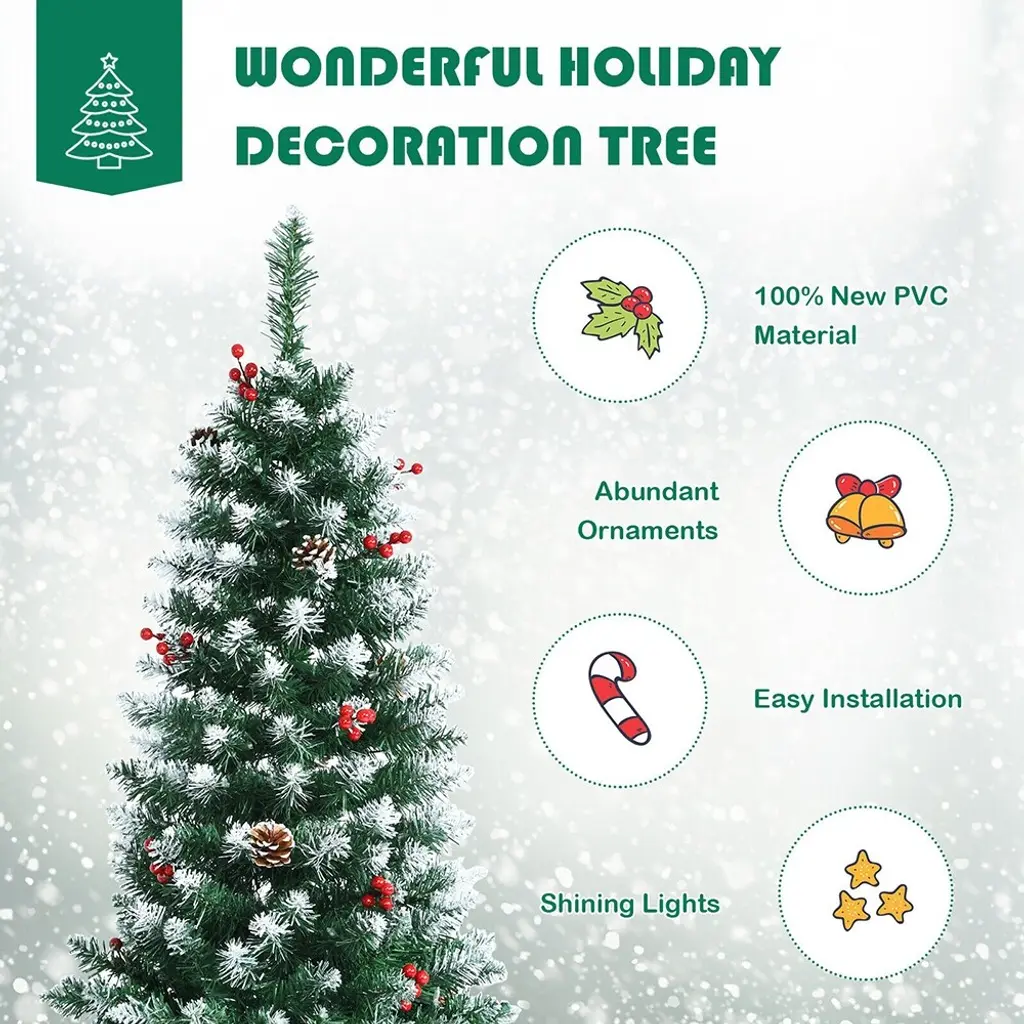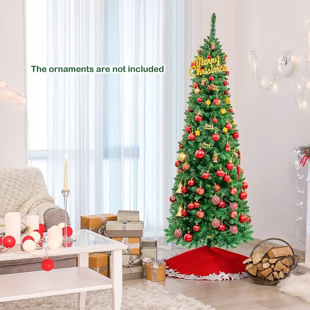 PRODUCT DETAILS: Description: This is our brand new 6.5 ft pre-lit pencil Christmas tree which is designed with 708 branch tips to offer a realistic and lush appearance. Pre-installed with 250 colorful LED lights, the slim tree saves you the hassle of hanging up the lights and help light up your room. It is effortless to make the tree fluff due to its hinged construction, while also facilitating its assemble and storage. Foldable X-shaped iron stand with foot pads prevents breakage and enhances the balance of the tree, offering stability to keep the wondrous tree standing all year around. Whether for your home, courtyard, or for commercial places like shops, hotels, the slim Christmas pencil tree is the perfect eye-catching decoration to add multiple fun and festive holiday fullness! Features: Pre-installed with 250 colorful LED lights for brilliant shine Slim pencil shape design takes up less space, ideal for any narrow place Crafted with 708 branch tips for leafy and realistic appearance Non-flammable and eco-friendly PVC material, not easily deformed All hinged construction convenient for assembly and storage Separated into 3 sections, easy to be placed in a tree storage bag X-shaped metal stand, wear and breakage resistant, offer more stability Foot pads effectively protect floors from scratching Simple style with plenty of space to hang ornaments as you like Eye-catching addition for homes, office, shops and other business places Match any style of room, add a rich Christmas atmosphere to you UL588 certified transformer for safer use Specifications: Color: green Main Material: PVC, iron Overall Dimensions: Φ2.2'×6.5'H Number of Tips: 708 tips Number of Lights: 250 Net Weight: about 11 Lbs Package Includes: 1×pre-lit Christmas tree 1×stand 1×adapter