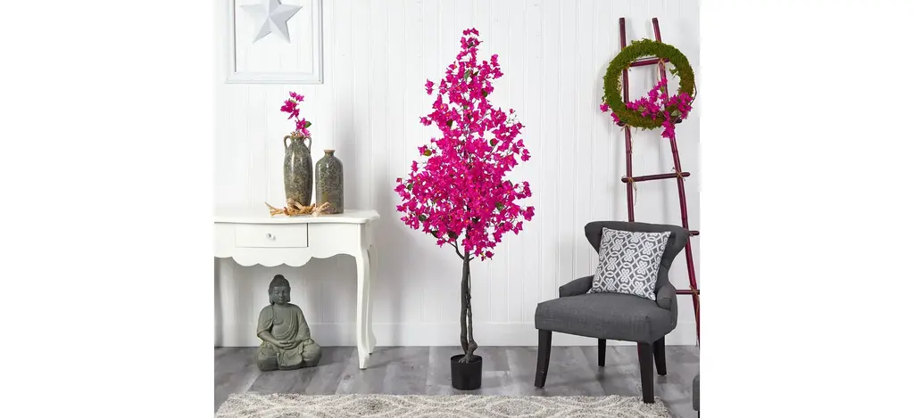 If you feel like showing your true colors, feel pretty in pink with this 6' Bougainvillea Artificial Tree. A palette of vivid colored flowers stem from a realistic brown trunk. Inspired by nature, the lifelike flowers will brighten and refresh any corner. Standing at 6', from a nursery planter, bring a colorful touch with vibrant flowers. Designed and approved by horticulturists, display in any room that needs to bloom such as bathrooms, home offices or kitchens. Artificial trees are manufactured using synthetic materials, such as polyester material or plastic, and are well designed and constructed to be life-like in appearance. Your artificial tree will look beautiful for years to come; simply wipe clean with a soft dry cloth when needed.