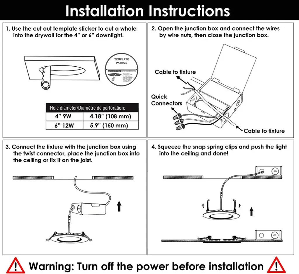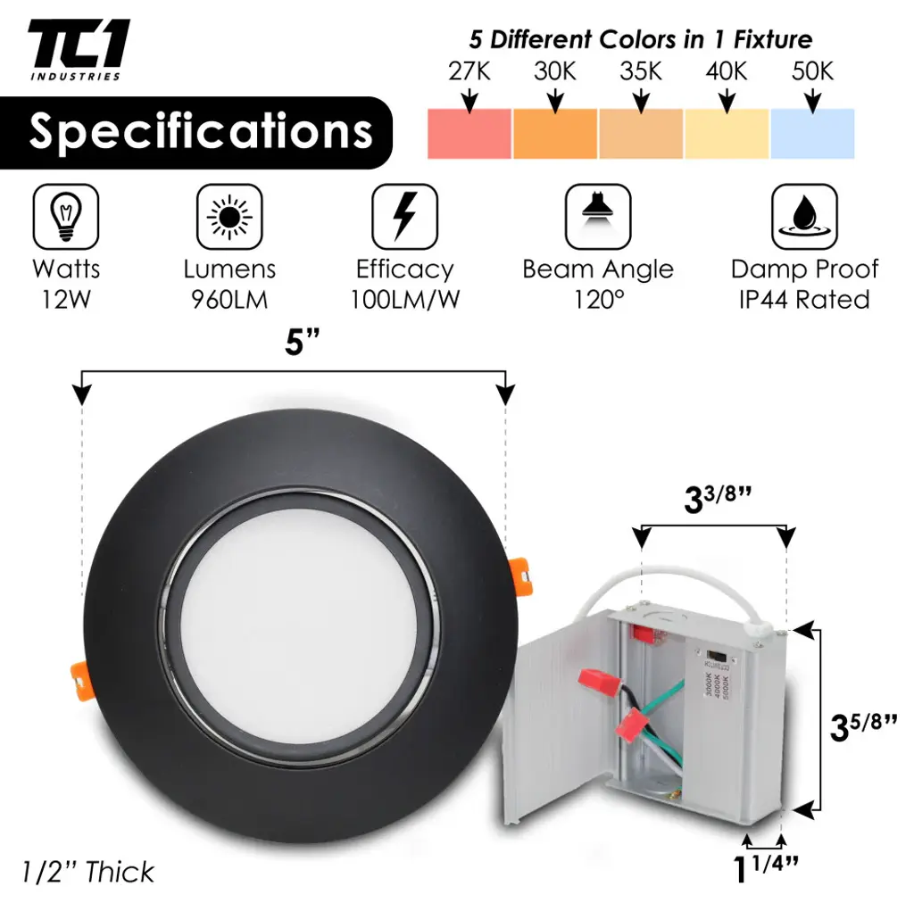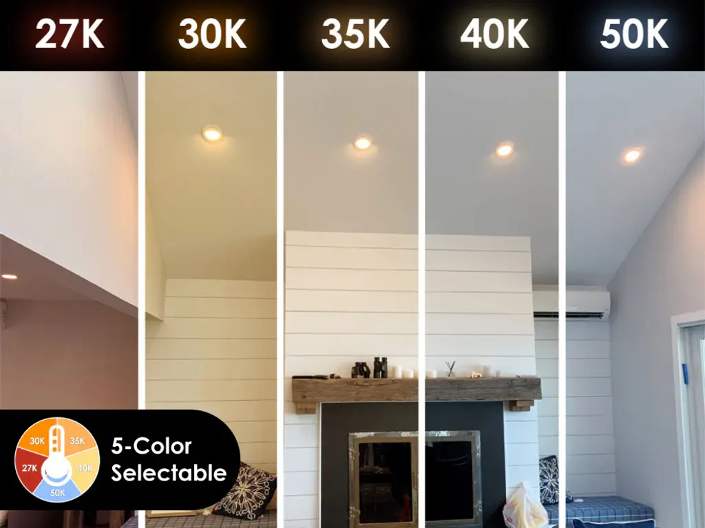 +New Gimbal Canless Adjustable Lens Downlight with easy quick connectors for fast installation.+Contractor Approved! With our new CCT Switch 2700K, 3000K, 3500K, 4000K, 5000K All In 1 Fixture now contractors can stock this product and your customers can choose the kelvin temperature that best suits your client''s needs!+Certification and Warranty - ETL and JA-8 certified for top quality standards and safe operation. This device has IC rated housing and approved to be installed into ceilings with insulated roof space, and can safely be in direct contact with insulation. Also, it is suitable for damp locations. Our fixtures are high quality, energy efficient and they come with a 5-year limited warranty.+Installation: Recessed Housing not required, installs directly into drywall. Connect the provided J-box to the light using male/female cable and use spring clip to fix it on the ceiling, hassle free, install in seconds. Recessed can is no longer a limitation for your choice+ Slim Design fits into tight ceiling spaces! This pot light is manufactured with heavy duty spring clips this light will not sag when installed into drywall.