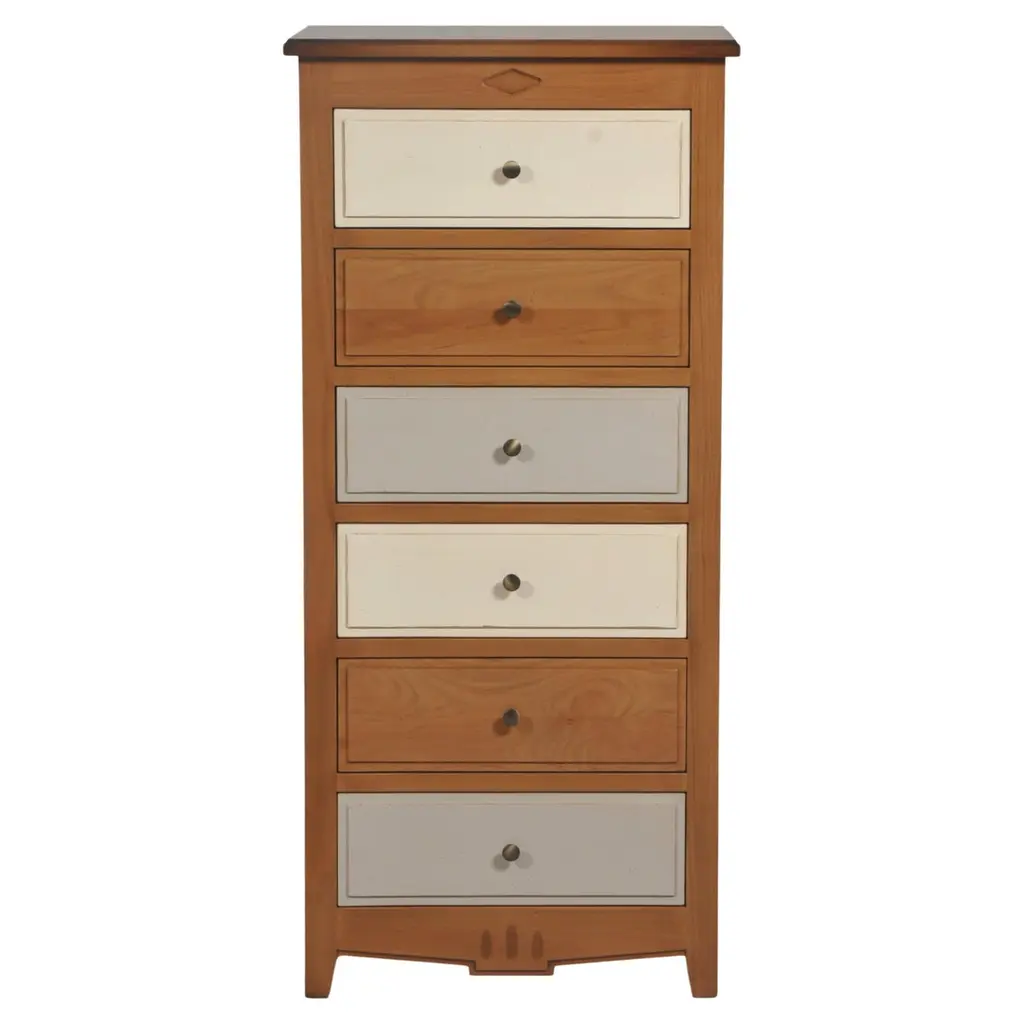 This Chiffonier Semainier belongs to our TRADITION collection, which takes its design and inspiration from the French countryside "proviincial" style, also called "Campagne chic" and finished with soft and charming lacquers. Semainier is the French word for "weekl-er". The six drawers are for each day of the week, except Sunday which was the Lord's day. This piece is made 100% of solid French cherry wood. Our solid wood comes exclusively from sustainably managed French forests.Each drawer's front is mounted with front drawers , each lacquered with a different color. The knobs are made of brass. The drawers are 46 cm wide, 14 cm high and 30 cm deep, inside. About GONTIER GONTIER is established in France since 1920 and is now a brand of MON PETIT MEUBLE FRANCAIS group. It provides you exclusively with 100% made in France classical and contemporary pieces of furniture.The manufacture of each furniture is made accordingly to traditional French techniques of woodworking by small craft workshops in the western countryside of France (Loire Valley and Bretagne). We offer a 5 year warranty on each piece.