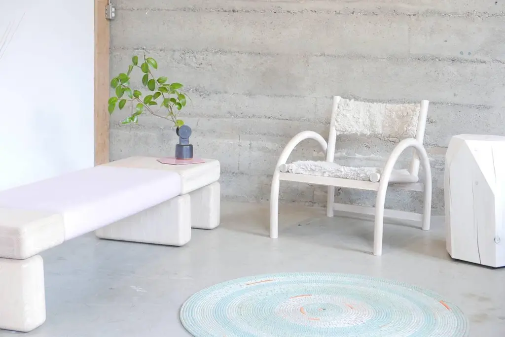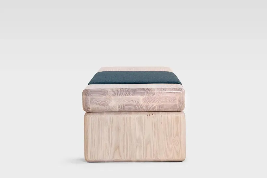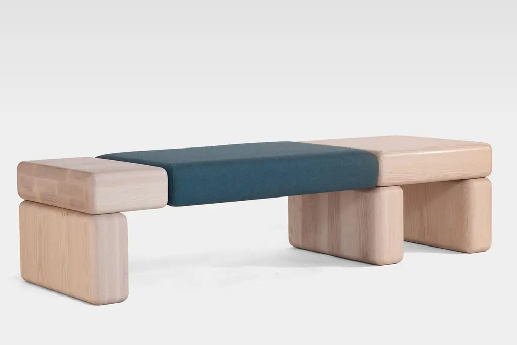Like logs washed up and resting along the shoreline, the soft corners of this pillow-top solid wood bench will be at peace anywhere. With side tables and an upholstered seat for two, this is a useful addition to any modern setting. Whether you see it as an assortment of driftwood blocks, pillows, or marshmallows, the Pillowy Bench provides a gentle place to land.Made out of solid Canadian white ash with a powder coated steel frame and 100% wool upholstered cushion seat, the Pillowy Bench can be customized to a variety of lengths and fabric colors. Shown in the main image is the 6-foot bench with dark green wool fabric and an upholstered seat length of 36". The subsequent images are a 7-foot bench ($6500) with a pale pink wool fabric and an upholstered seat length of 48". All benches are 24" deep with a 17.5" seat height.This bench is highly customizable to meet your needs. Cushion upholstery is offered in a variety of fabrics, either COM or a selection of Maharam wool fabrics: Beck or Luce. Please contact Hinterland Design to discuss options. Hinterland designs and manufactures each of their pieces in its Vancouver, Canada workshop.