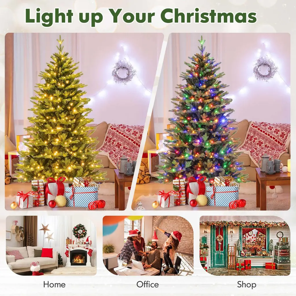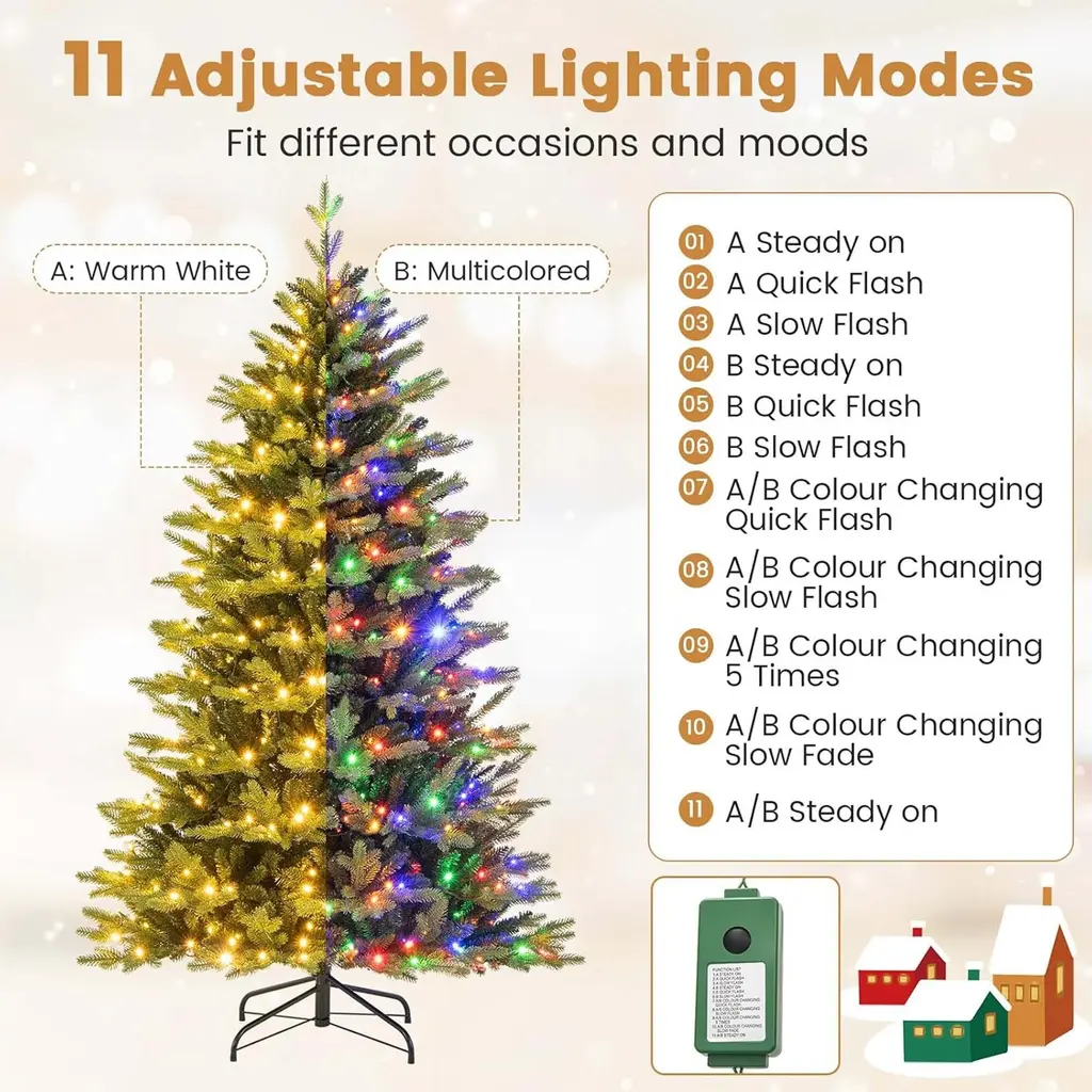Create Memory Moments and Enchanting Displays! Ou pre-lit artificial Christmas tree boasts 1168 full-bodied branch tips that are intricately crafted from a blend of vivid PE and PVC leaves, mimicking the natural look and feel of a traditional evergreen. The color-changing LED lights provide a mesmerizing display, offering both warm white and multicolored options with 11 lighting modes and 4 adjustable brightness levels to create the perfect festive atmosphere. And there are memory function and 3 timer settings or added convenience. Thanks to its 3-section design, flexible hinges that connect the trunk and branches, and a pre-assembled screw that eliminates the need for hole alignment, setting up this tree is a breeze. Moreover, crafted from flame-retardant PVC and PE leaves, supported by a sturdy crossed metal base, this tree ensures durability and safety for worry-free enjoyment. Features:Specification