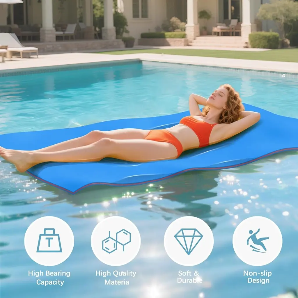 This floating water mat is made of 1.5-inch tear-resistant and UV-resistant three-layer environmentally friendly XPE foam. This floating water pad is made up of three layers of tear-proof XPE foam, which is of good quality, does not absorb water and is not easily deformed. This environmentally friendly material is odorless, bouncy, safe, and smooth surface can make you more comfortable.Features: