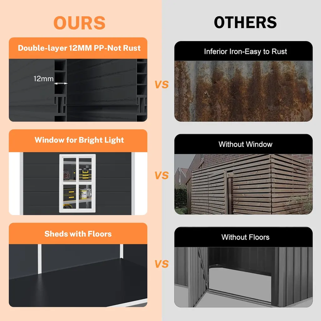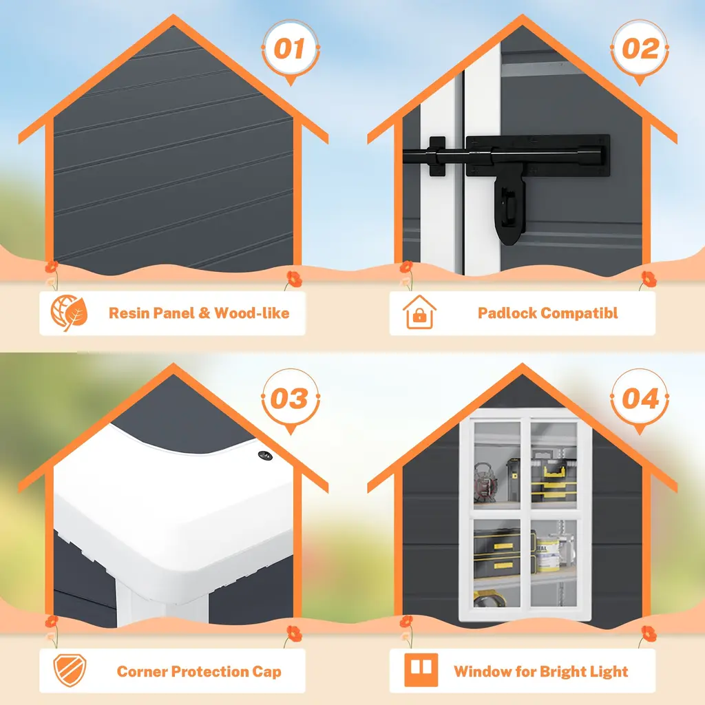 Say goodbye to clutter and disorder with our big spire all-weather resin outdoor plastic storage shed. With its ample storage interior capacity, you can organize all your outdoor storage needs while maintaining a compact footprint. Its sturdy plastic construction ensures durability and long-lasting performance, making it a reliable storage solution for years to stand the test of time. Our shed has a modern and simple look and absolutely blends seamlessly with any home decor. Good job! Keeping your backyard and garden tidy and well-maintained is so easy!Specification:Notice:
