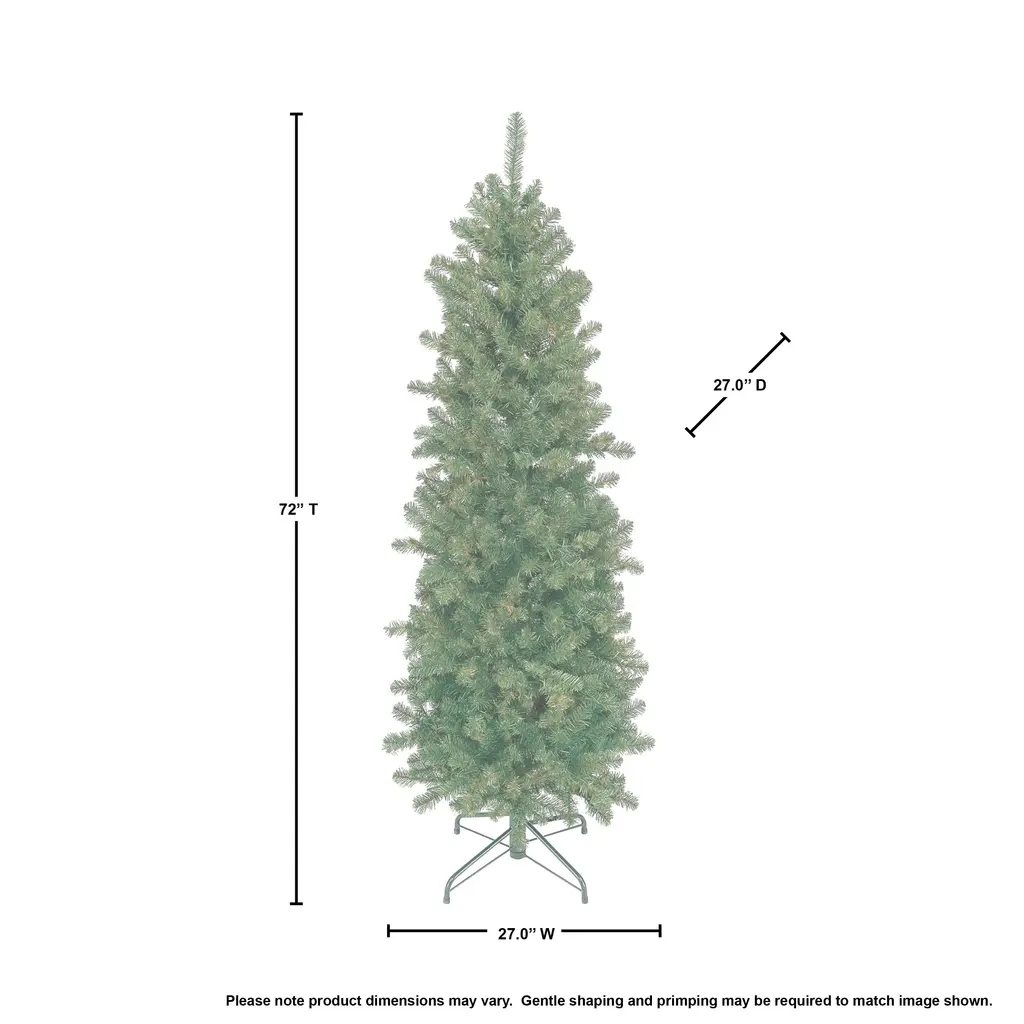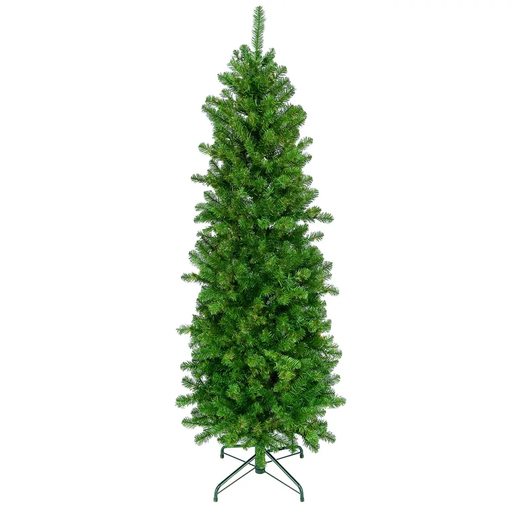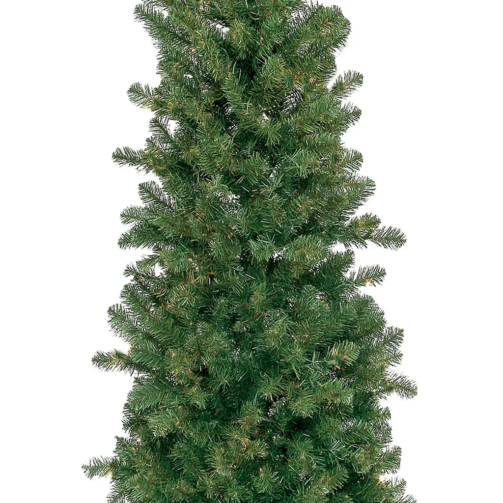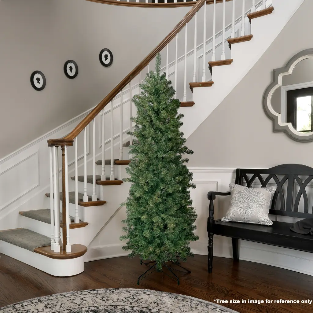 Designed for convenience, the 6' Hudson Valley Pencil Tree combines style and convenience in a delightful package. With its slender 27" diameter, it's perfect for those cozy spaces where a full-sized tree just won't fit. Ideal for apartments, smaller rooms, or as a secondary tree, this pencil tree fits beautifully in any setting, from living rooms to entryways. Featuring 608 lush branch tips, the Hudson Valley Pencil tree offers a full, natural look that brings the beauty of nature indoors. Made from high-quality PVC, designed to last, ensuring your décor looks beautiful year after year. Complete with an easy on/off footswitch located on the 26" plugin cord, simply turn on and off with just a tap of your foot, no more bending over to unplug lights. Includes a metal folding tree stand, replacement bulbs, and fuses. Recommended care store in a cool, dry place for many years of use. Enjoy the beauty of nature wherever you go!