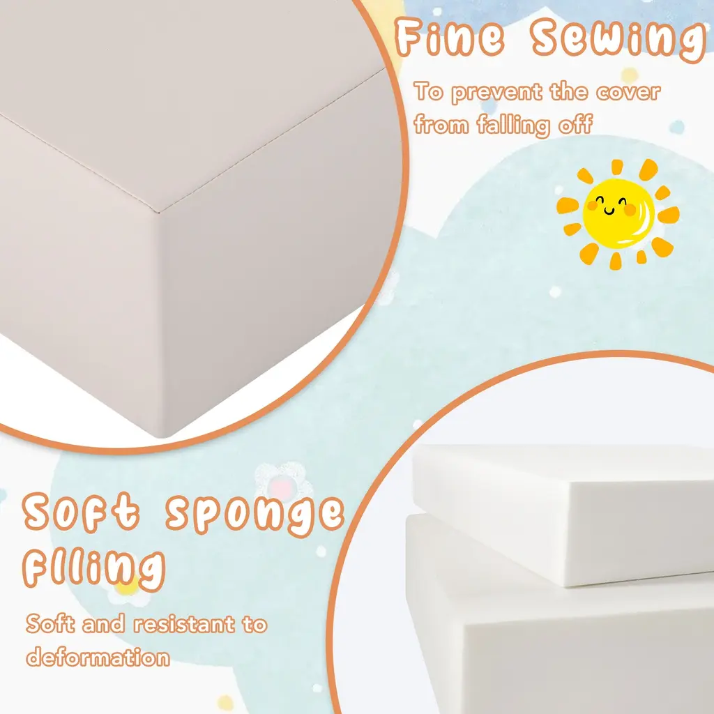 Durable Materials: This crawling toy set is well-crafted using high-quality EPE foam inner lining and a soft, skin-friendly surface, ensuring long-lasting use and safety for kids.All-round Play: As an integral part of a perfect indoor playground, this climbing toy set allows toddlers to engage in a variety of activities such as lifting, carrying, stacking, sliding, and more.Varied Components: The crawling toy set comes equipped with a staircase, square mat, rectangular mat, fan-shaped mat, wavy climbing mat, and a cylinder, providing a diversity of play options for children.Secure Fastening: Each component of this toy set features Velcro fastening straps on the sides that hold the various pieces securely in place, preventing any accidental slips or mishaps.Easy Maintenance: The surface of this crawling toy set comprises high-quality materials that can be easily cleaned and maintained by wiping with a damp cloth, ensuring that children's play area stays clean and hygienic at all times.