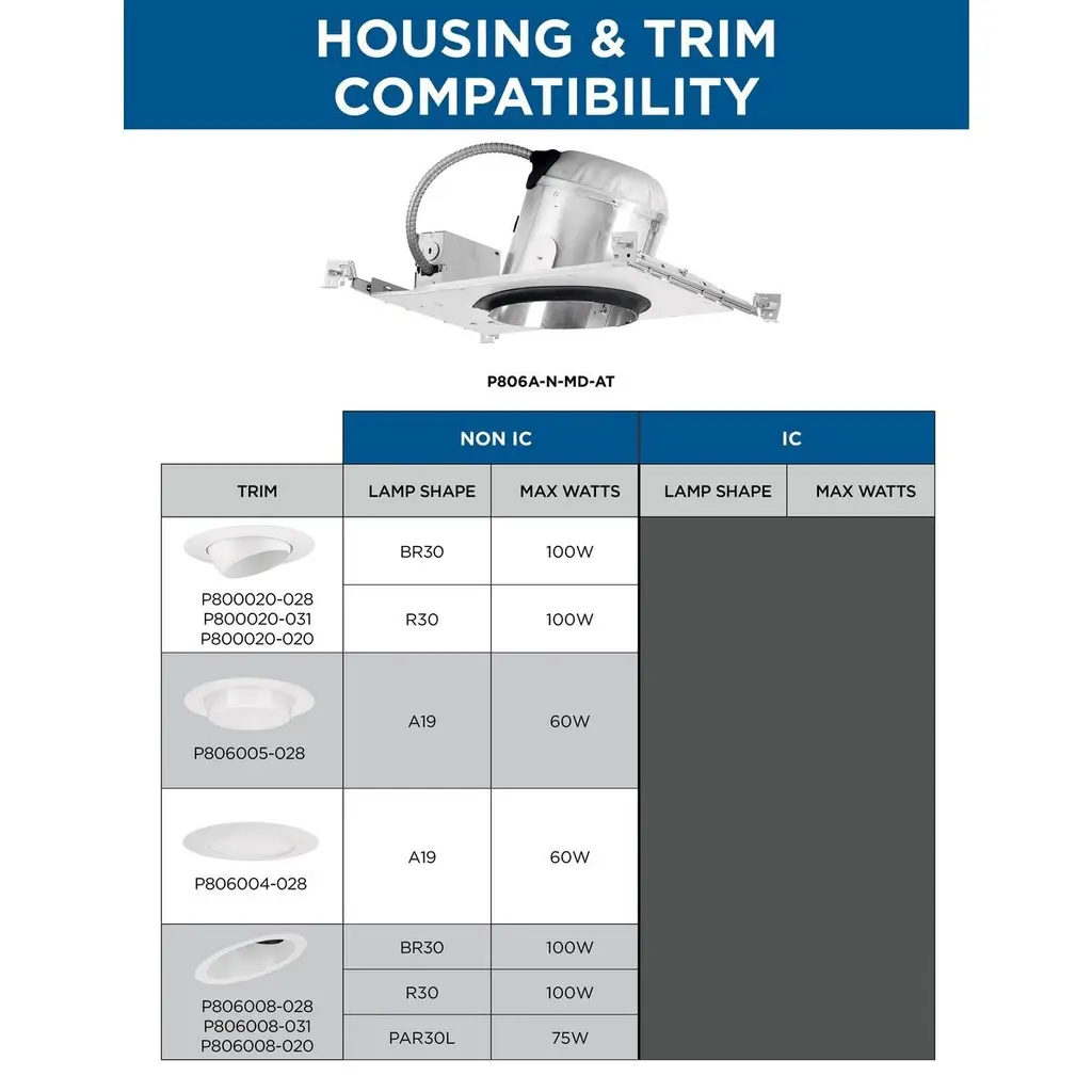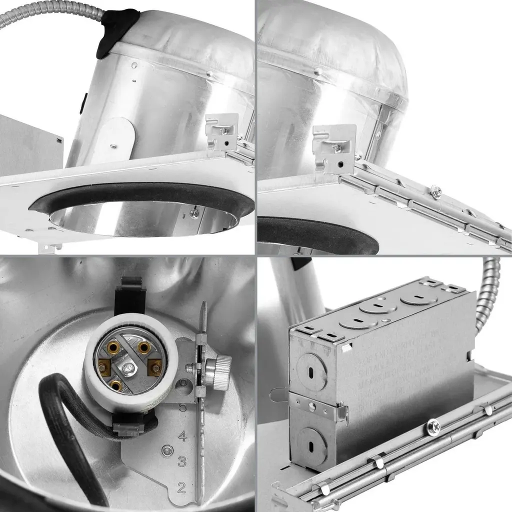 This 6 in. Sloped Ceiling Non-IC Recessed Housing with Quick Link Connector has several great installation features plus an Air-Tight rating. It is ideal for non-IC new construction applications. Its gasketed Air-Tight housing restricts airflow from conditioned spaces into unconditioned attic space, preventing unnecessary HVAC costs and improving the overall home energy efficiency. The housing and frame are constructed from die-formed corrosion resistant galvanized steel. The lamp housing compartment can be adjusted to fit ceiling thicknesses from ½ in. to 1 ¼ in. The socket position can be adjusted to accommodate ceiling pitches from 2/12 to 7/12 pitch. It features a universal J-box with snap-out sides. Wiring is made easy with the included wiring quick-connects that allow simple installation of 12-20 AWG wire without using separate wire nuts - simply strip supply wires and push in. The housing has pre-installed nails on the adjustable hanger bars which are easily installed in regular lumber, engineered lumber, and laminated beams. Hanger bars include t-bar mounting clamps for use in suspended t-grid ceilings. The bar hangers have a maximum span of 24 in. and are scored in two locations for fast, clean breaking, allowing housing installation in very narrow joist spacings. It is UL and CUL listed for damp locations and is thermally protected against improper use of lamps.