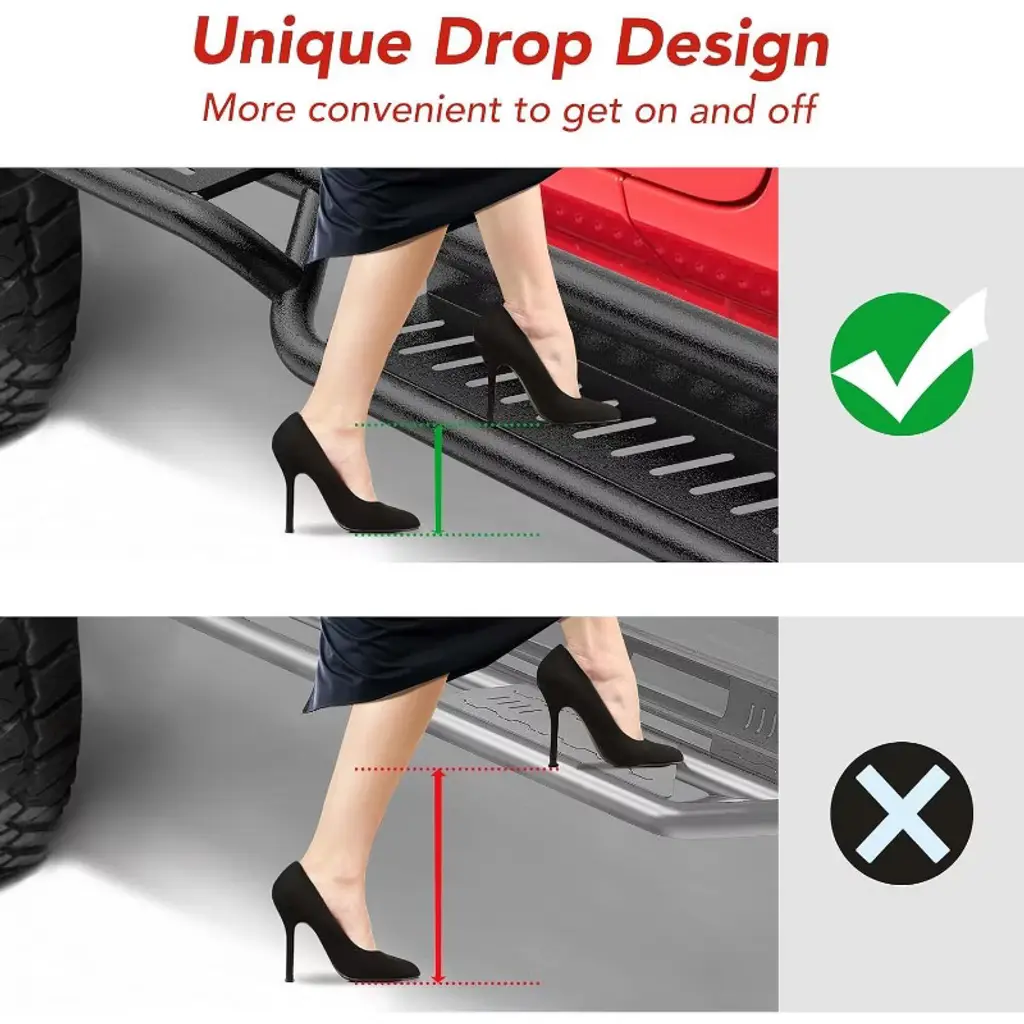 Upgrade your 2007–2018 Wrangler JK/JKU Unlimited 4-Door with 6-inch running boards designed to match factory lines and make everyday use easier. The step layout helps everyone get in and out of lifted rigs with oversized tires, and makes rooftop tasks—loading a rack, strapping gear—more manageable. Built from robust steel with a black powder-coated finish, they stand up to road salt and harsh weather. Laser-cut, non-slip step plates provide steady footing and support up to 550 lb without flex. Installation is quick and drill-free: bolt on with the included brackets and hardware, then fine-tune the alignment since the brackets are not pre-welded. If you prefer, professional installation is recommended. From weekday errands to weekend trails, these boards add practical access, confident traction, and a clean