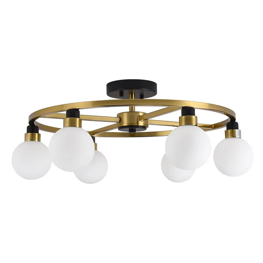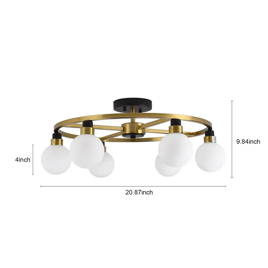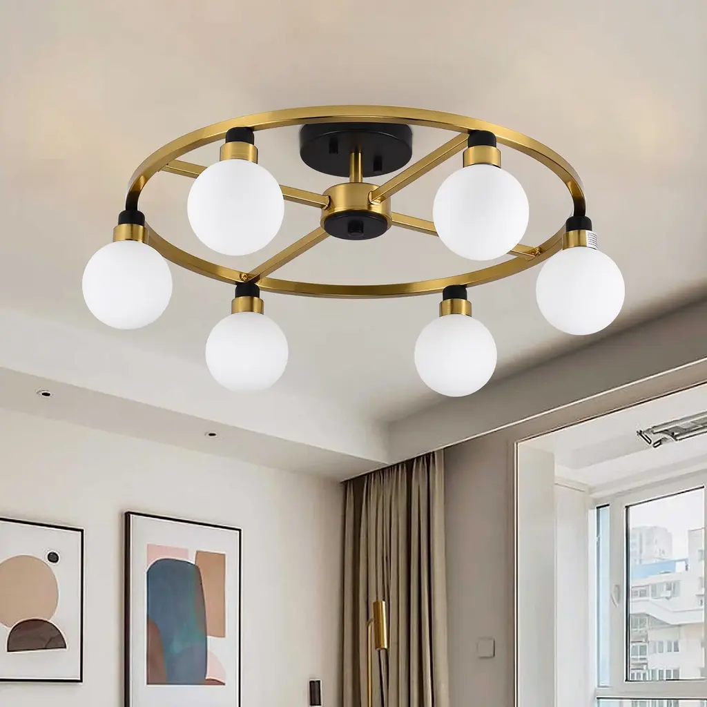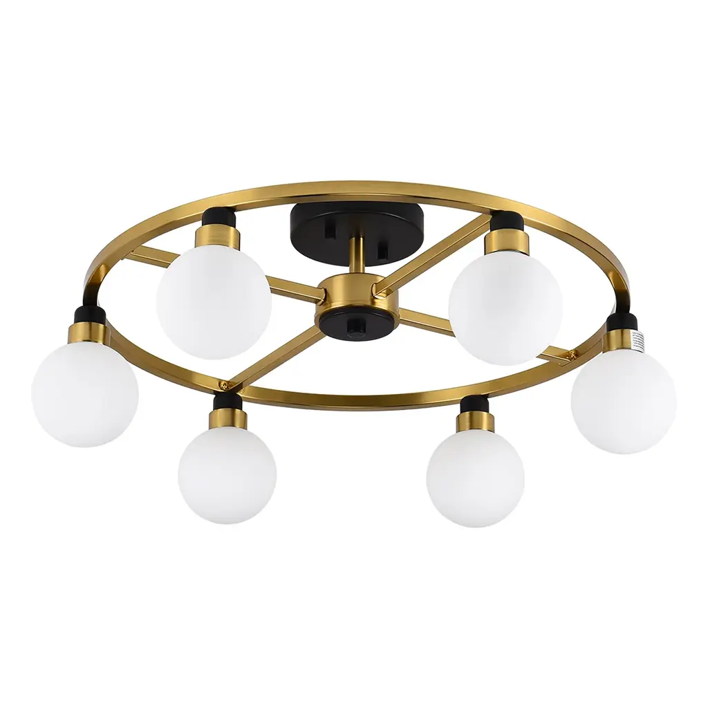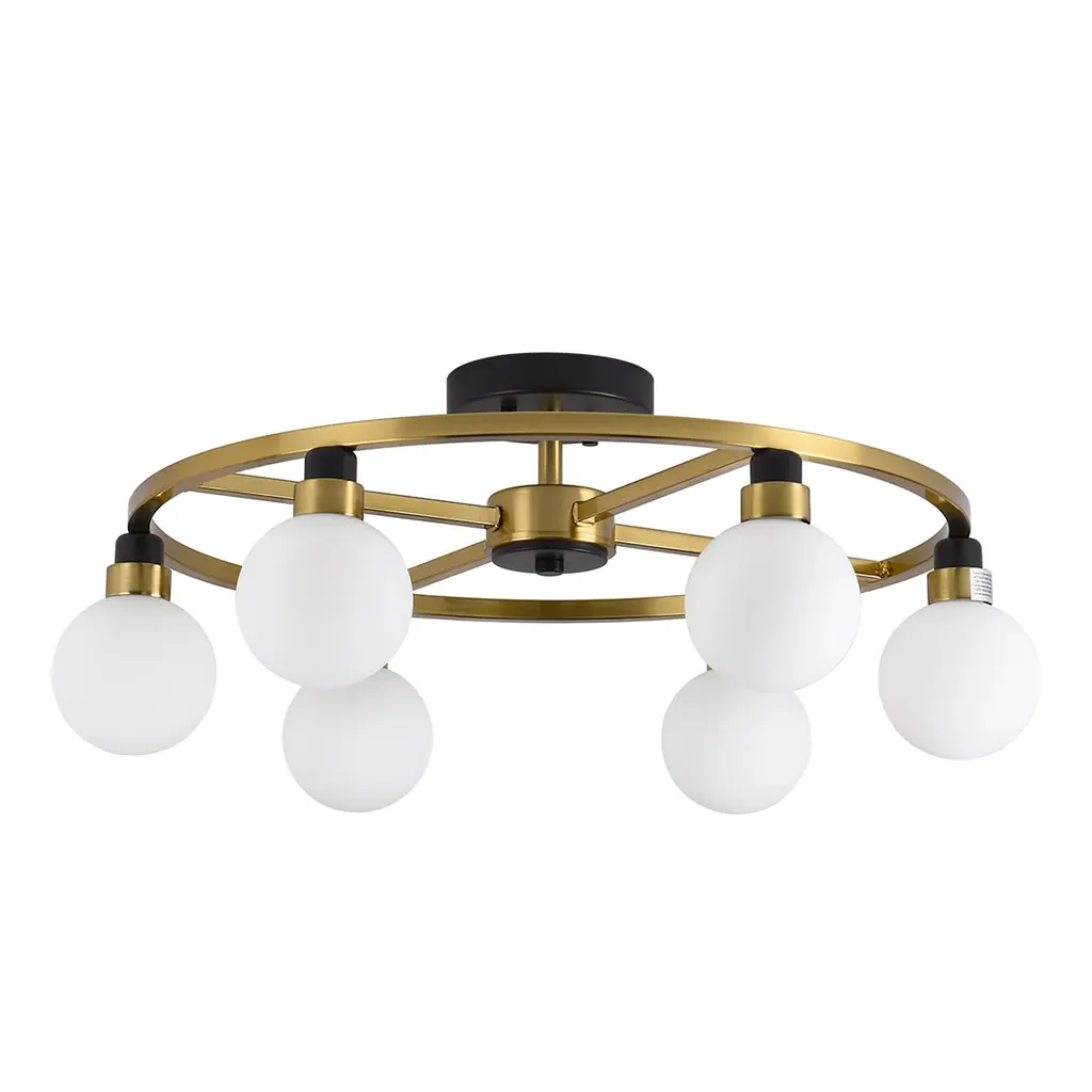 Detail:Illuminate your space with modern elegance using this 6-light semi-flush mount ceiling fixture. Featuring a striking combination of matte black and luxurious gold finishes, this light brings a sleek, contemporary touch to any room. The frosted glass globe lampshades soften the light, creating a warm and inviting atmosphere. Designed with 6 G9 bulb base (bulbs not included), this fixture provides ample lighting for bedrooms, living rooms, or dining areas. With its compact, stylish design, this ceiling light fits perfectly in spaces with lower ceilings, offering a refined yet functional lighting solution.Feature:Easy installation: The installation process of this ceiling light is simple and easy to understand, with a complete set of accessories, even non-professionals can easily get started and finish the installation quickly, saving time and energy.Exquisite size: the overall diameter is 20.87 inches, height 9.84 inches, lampshade diameter 4 inches, compact size to fit a variety of spaces, will not look too large or constricted.Bulb Configuration: G9 size bulbs with 6 positions provide sufficient and even illumination to meet daily lighting needs, while making it easy to replace bulbs.Versatile style: Gold and black metal frame with white spherical lampshade, presenting a simple and stylish yet elegant appearance, whether it is modern minimalist, Scandinavian style or light luxury style interior decoration, can be perfectly integrated.Wide application: suitable for a variety of indoor scenes, such as living room, bedroom, dining room, study room, etc., can be used as the main lighting fixture to create a warm and bright atmosphere, but also can be used for auxiliary lighting to enhance the style of the space .
