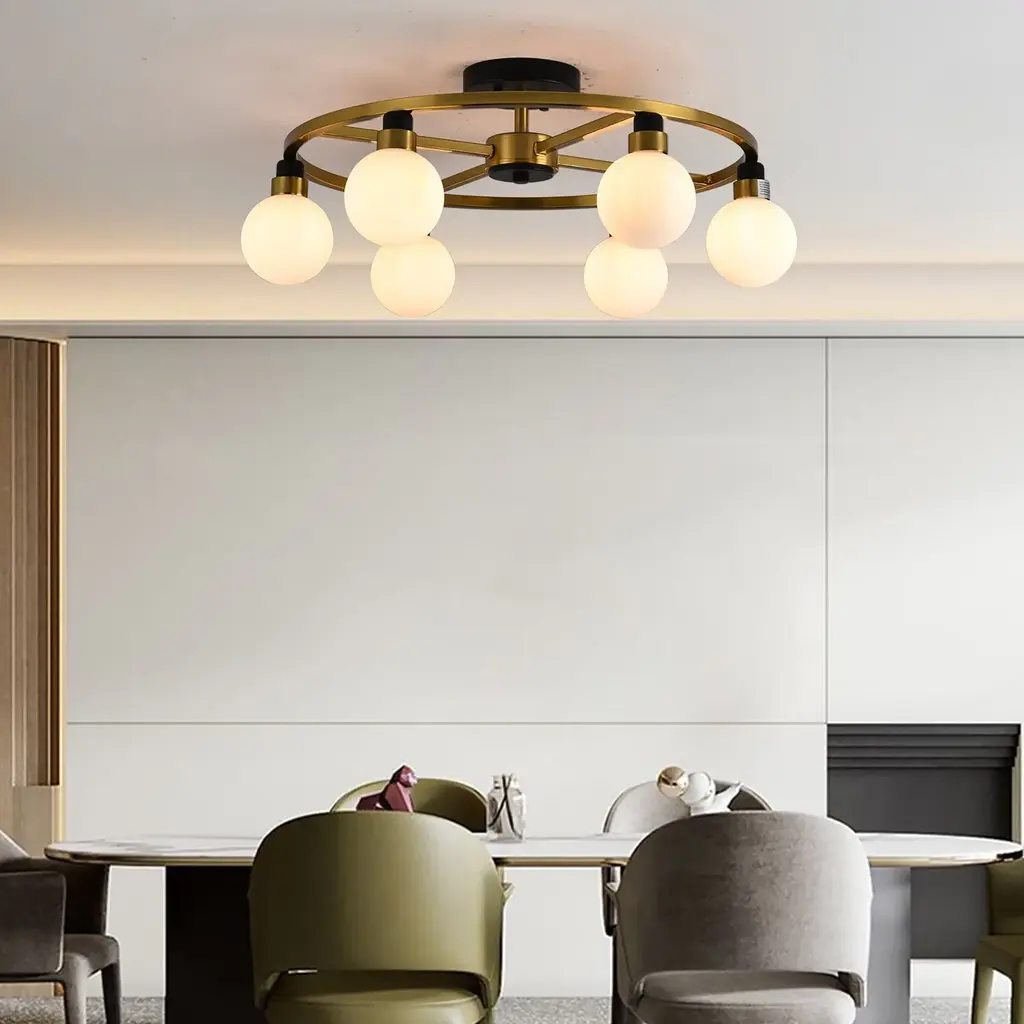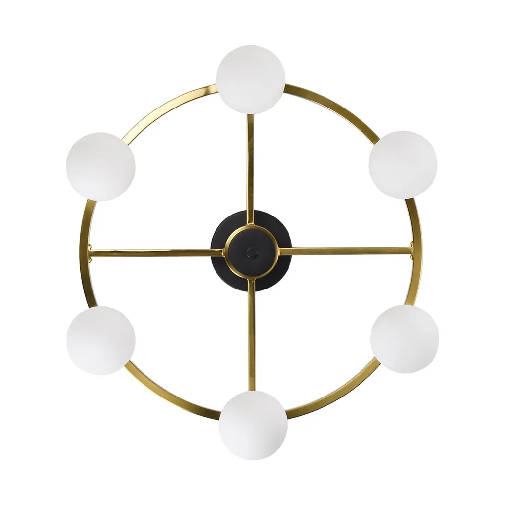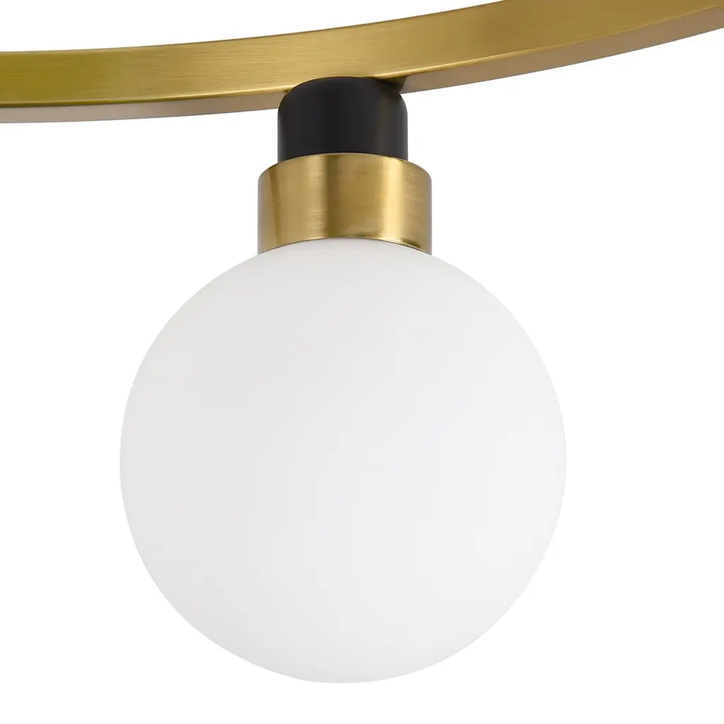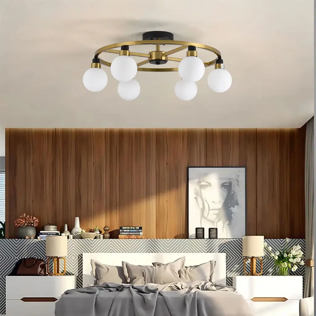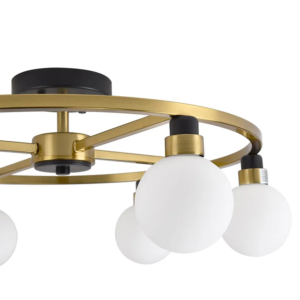 Detail:Illuminate your space with modern elegance using this 6-light semi-flush mount ceiling fixture. Featuring a striking combination of matte black and luxurious gold finishes, this light brings a sleek, contemporary touch to any room. The frosted glass globe lampshades soften the light, creating a warm and inviting atmosphere. Designed with 6 G9 bulb base (bulbs not included), this fixture provides ample lighting for bedrooms, living rooms, or dining areas. With its compact, stylish design, this ceiling light fits perfectly in spaces with lower ceilings, offering a refined yet functional lighting solution.Feature:Easy installation: The installation process of this ceiling light is simple and easy to understand, with a complete set of accessories, even non-professionals can easily get started and finish the installation quickly, saving time and energy.Exquisite size: the overall diameter is 20.87 inches, height 9.84 inches, lampshade diameter 4 inches, compact size to fit a variety of spaces, will not look too large or constricted.Bulb Configuration: G9 size bulbs with 6 positions provide sufficient and even illumination to meet daily lighting needs, while making it easy to replace bulbs.Versatile style: Gold and black metal frame with white spherical lampshade, presenting a simple and stylish yet elegant appearance, whether it is modern minimalist, Scandinavian style or light luxury style interior decoration, can be perfectly integrated.Wide application: suitable for a variety of indoor scenes, such as living room, bedroom, dining room, study room, etc., can be used as the main lighting fixture to create a warm and bright atmosphere, but also can be used for auxiliary lighting to enhance the style of the space .