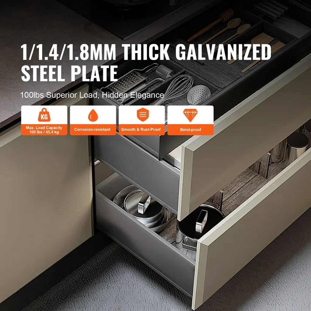100lbs Outstanding Load Capacity: Our galvanized steel design supports a 100lbs weight capacity, clever space configuration, and corrosion resistance. Choose us for quality design and create a beautiful, hassle-free home. Silent Soft Close: A gentle push results in automatic closure, with springs on both sides ensuring a seamless and smooth closing. The dampening hydraulic cylinder provides automatic rebound, and it comes with a 3D adjuster and metal plate for precise calibration, making it suitable for American-style cabinets. Three-Stage Full Extension: No need to search for items - our three-stage full extension drawer design allows for easy and clear access to your belongings. Compared to two-stage designs, it completely eliminates blind spots, making operation more convenient. 3 Universal Sizes: Available in 15", 18", and 21" universal sizes, compatible with various mainstream drawer slide brands, offering flexible replacement options. Installation Guidance: Easily address the pain points of using bottom-mount concealed drawer slides, suitable for drawer side panels with thicknesses of 1/2 inch and 5/8 inch, making the installation process simpler and avoiding unnecessary hassles. Package Content Drawer Slides x 6 Handles x 20 Self-tapping Screws ST3.5x11 x 1 Pack
