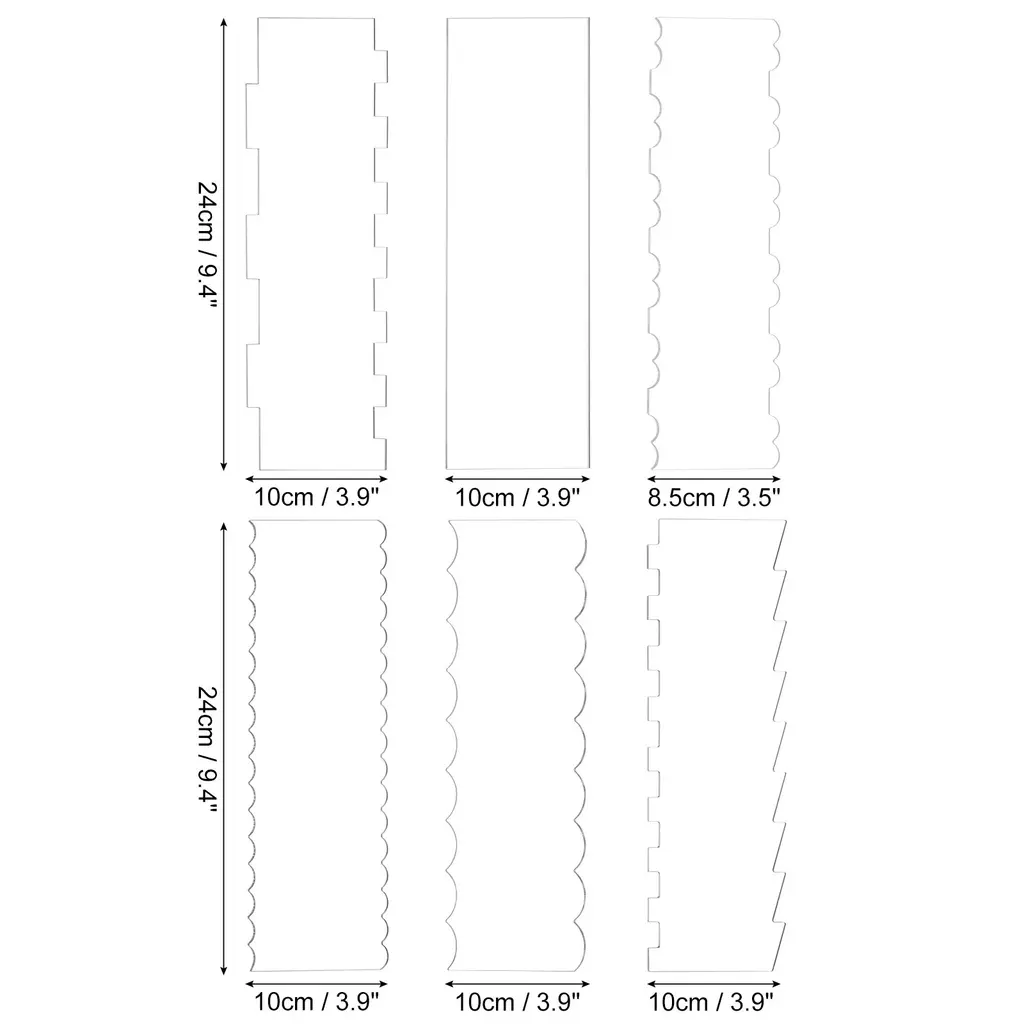Description:Our cake edge combs are versatile and can be used for a variety of desserts. From spreading butter on toast to decorating cakes for special occasions like birthdays and weddings, these combs are a must-have tool in any kitchen. The frosting smoother, on the other hand, is made from a durable acrylic material that provides both strength and flexibility. Its smooth edges allow for a precise, clear finish, while the firm, comfortable edges smooth frosting with ease. Our cake decorating tool allows you to effortlessly create stunning designs on the sides of your cakes. Simply glide the tool across the cake to achieve a smooth finish.Specification:Length:24cm/24cm/24cm/24cm/24cm/24cm(9.4"/9.4"/9.4"/9.4"/9.4"/9.4");Width:10cm/10cm/10cm/10cm/10cm/8.5cm(3.9"/3.9"/3.9"/3.9"/3.9"/3.5" );Thickness:1.7cm/1.7cm/1.7cm/1.7cm/1.7cm/1.7cm(0.7"/0.7"/0.7"/0.7"/0.7"/0.7");Material: AcrylicColor: ClearPackage Content:6 x Cake Scraper(6 different shapes)