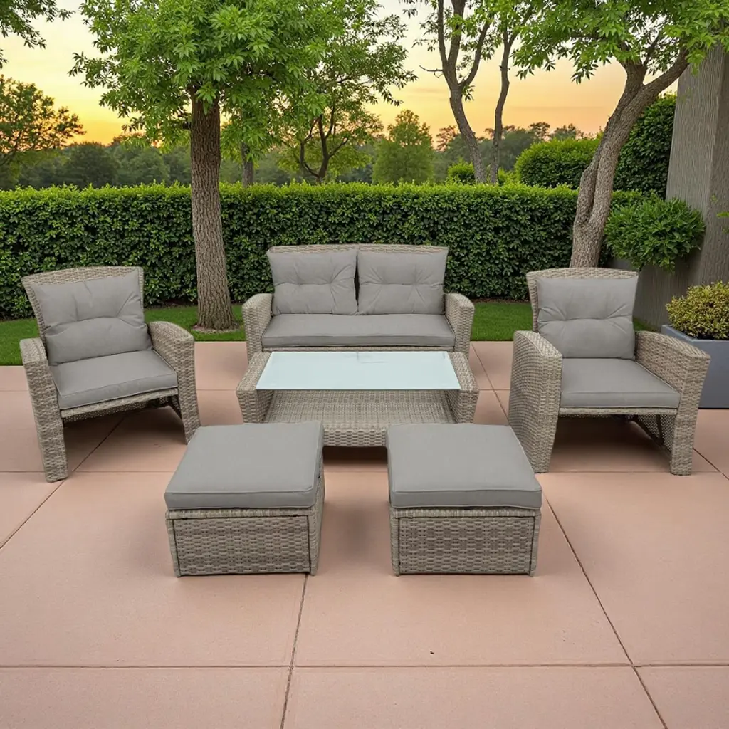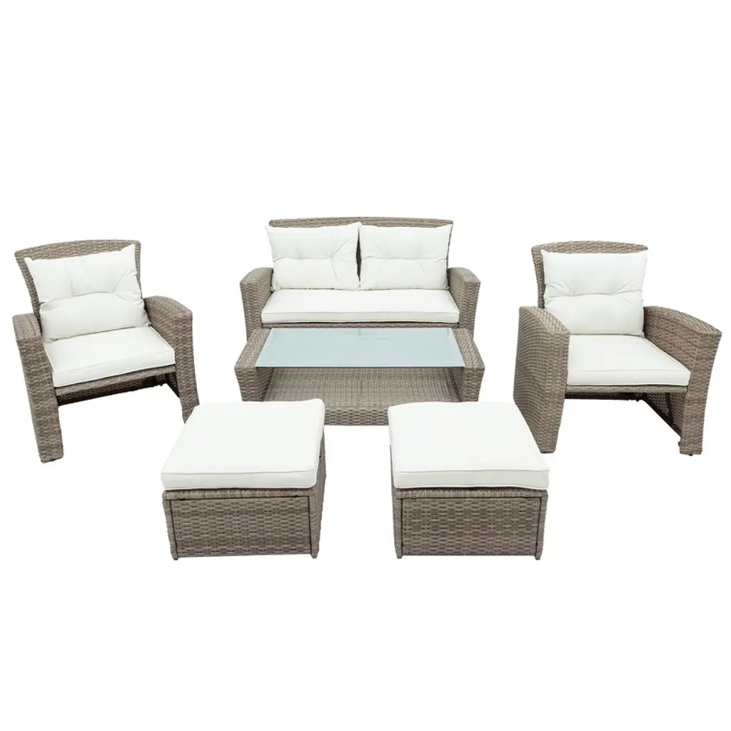 6-piece Outdoor Patio Rattan Conversation Sofa Set With Tempered Glass Coffee Table And Ottoman