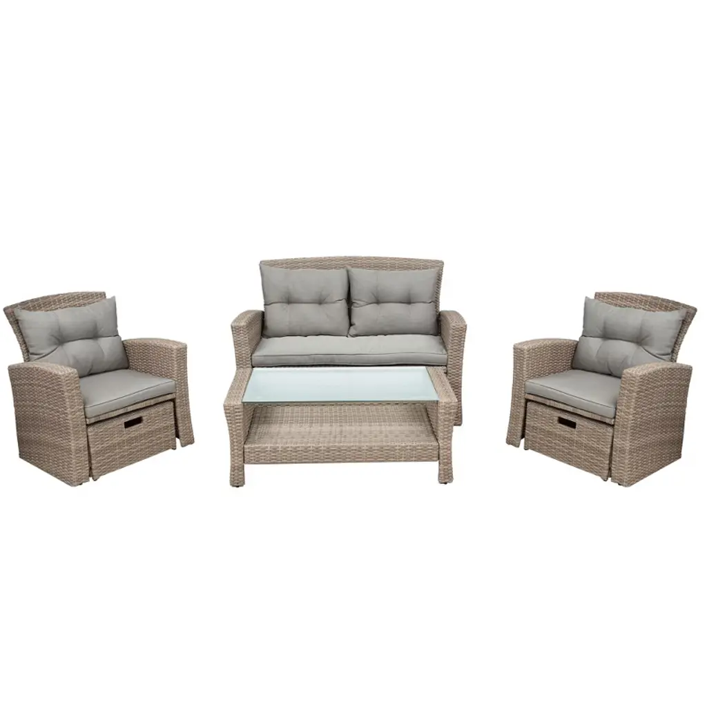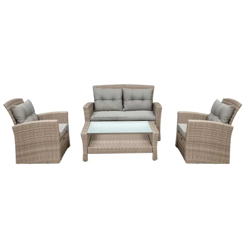 Transform your outdoor space with the Outdoor Tengbian Furniture Set, designed to bring both style and comfort to your patio, garden, or balcony. Featuring a trendy rattan motif, this set combines durability with elegance, making it the perfect addition to any outdoor setting. Product Features Trendy Rattan Motif: The intricate weave of the rattan not only offers a classic look but also ensures that the furniture will withstand the elements. Its stylish design blends seamlessly into modern and traditional outdoor spaces, providing both form and function.Ultimate Comfort: With thick cushions and backrests, the Tengbian sofa set is designed for relaxation. It cradles your back and waist, offering support where you need it most for hours of comfortable lounging with friends and family.Perfect for Socializing: This set includes a love seat, two single sofas, and a coffee table, ideal for a small gathering or outdoor entertaining. Whether you’re hosting a barbecue, picnic, or just relaxing in the open air, this set is designed to create the perfect atmosphere.Durable and Easy to Assemble: The furniture is made from high-quality PE rattan, a material known for its ability to withstand various weather conditions. The set also comes with detailed instructions, ensuring a simple and quick assembly process. Dimensions Twin Seat Size: 50" x 27.5" x 31.1"Single Seat Size: 27.5" x 27.5" x 31.1"Coffee Table Size: 38.9" x 19.6" x 15.3" Specifications Items Included: 1 Love Sofa, 2 Single Sofas, 1 Coffee TableTable Top Material: GlassFrame Material: PE RattanSeating Capacity: 4Single Sofa Weight Capacity: 220 lbsLove Sofa Weight Capacity: 440 lbsSupplier Intended and Approved Use: Residential Use Notice Color: Due to lighting or screen display, the actual color may slightly differ from the images. Please refer to the actual product for the precise color.Size: Manual measurements are used, so slight variations may occur. Enhance your outdoor living with the Tengbian Furniture Set, combining style, comfort, and durability for the ultimate outdoor experience. Perfect for relaxing or entertaining, this set is a must-have for anyone looking to make the most of their outdoor space.