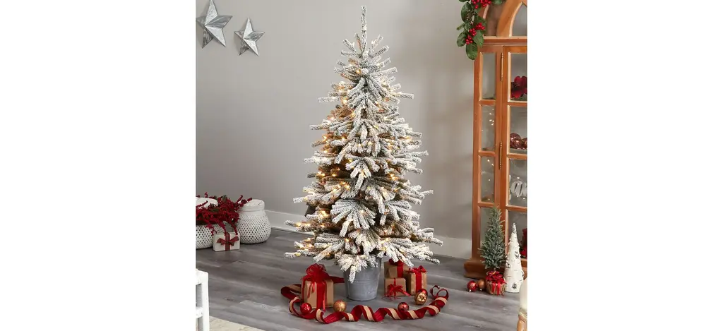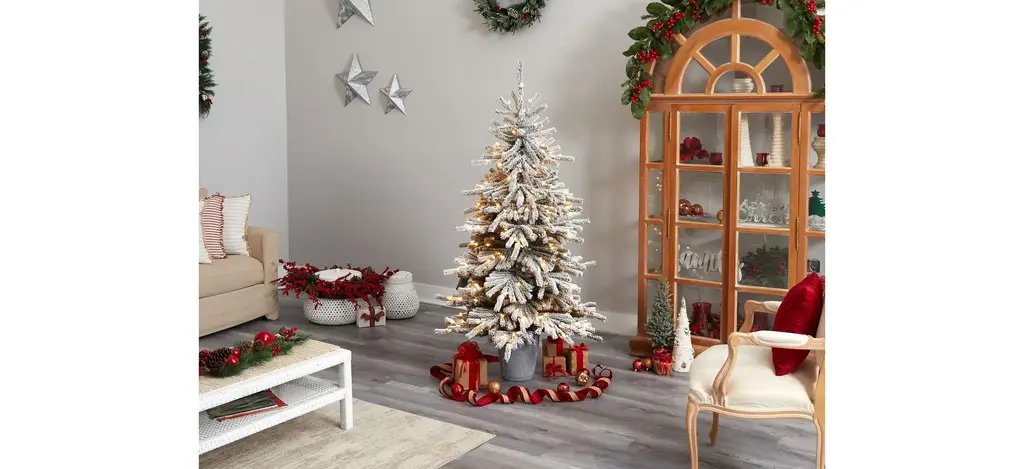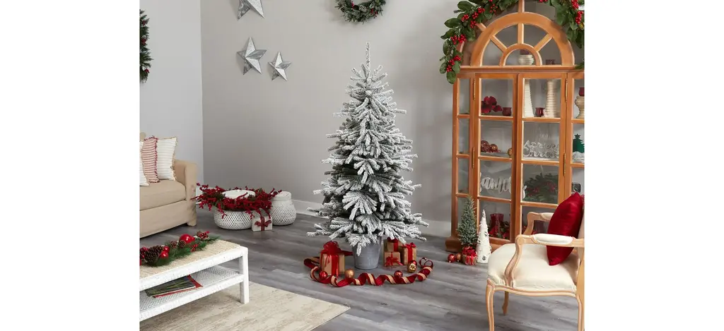 Bring the outdoors in, literally, with the 6' Flocked Long Vermont Pine Artificial Tree rustic, natural looking, Layered Washington Spruce Artificial Tree. Sparse by design with spacious gaps that allow you to showcase your favorite ornaments.
