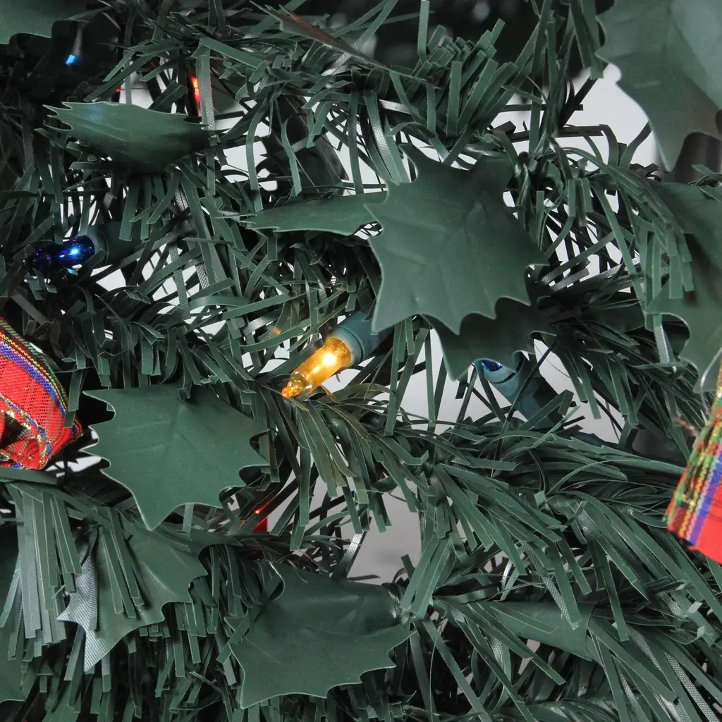 Are you sick of the long drawn-out process of setting up your Christmas tree piecing sections together fluffing the branches then having to string it with lights tirelessly? If so this is the perfect tree for you! This "pop-up" tree's collapsible design allows it to be set up in mere seconds. The tree comes pre-decorated with red and gold ornaments poinsettias and plaid ribbons and pre-strung with multi incandescent mini lights making set up a breeze. When the season is over it can be collapsed just as easily and stored away for next year. Perfect for apartments dorm rooms or families who want to relax and enjoy the holiday without the hassle. Product Features: Pre-lit with 350 multi-color lights. Multi-color consists of red green blue and yellow bulbs. Bulb size: mini. Bulb type: incandescent. 24" green lead cord. Green inner pole. Red and gold 60mm balls. Red poinsettias and plaid ribbons and bows. Additional Product Features: Light sets on tree are UL certified and approved for indoor or outdoor use however the tree itself is recommended for indoor use only. If one bulb burns out the rest will stay lit. Lights are equipped with Lamp Lock feature which makes them replaceable interchangeable and keeps them from falling out. Easy pop-up assembly. Comes with replacement bulbs spare fuse and a green plastic tree stand. Wire gauge: 22. 120 volts 60 hertz 0.5 amps 60 watts. Dimensions: 6' high (from the base of the stand to the top of the tree). 31" base diameter (at the widest point). Material(s): PVC/metal/glass bulbs/wire/plastic/polyester