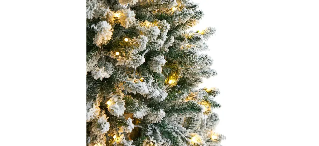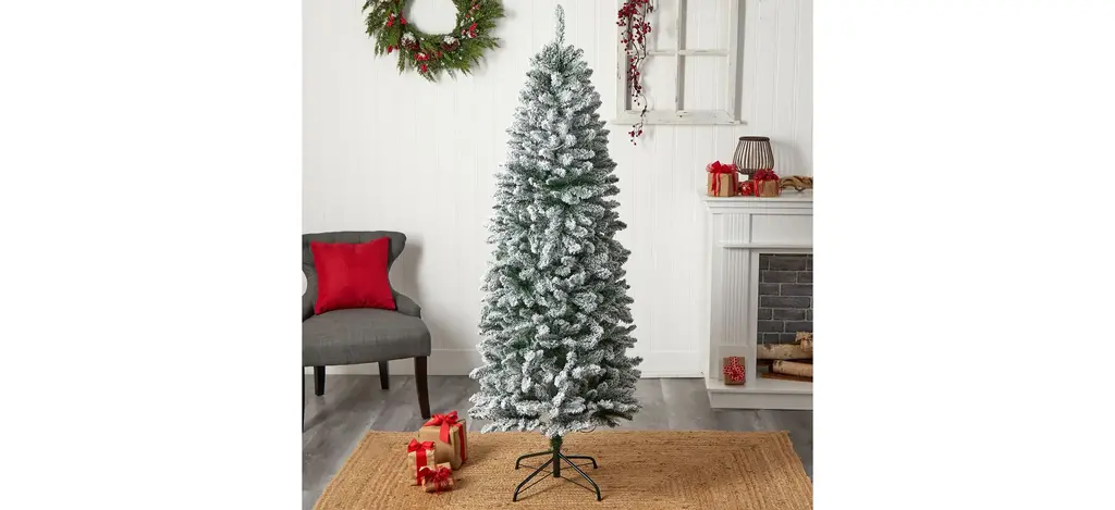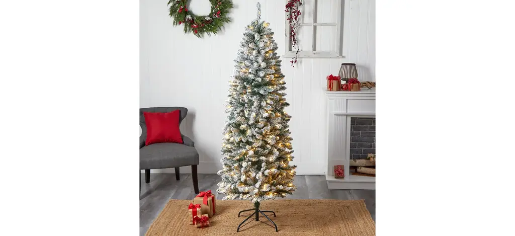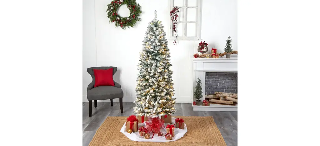 Transform your home into an enchanting winter wonderland with the 6' Pre-Lit Slim Flocked Montreal Fir Artificial Tree. If you dream of a white Christmas, these artificial trees are designed to mimic the texture and foliage of real trees with their upward sloping branches that can easily house mini ornaments.