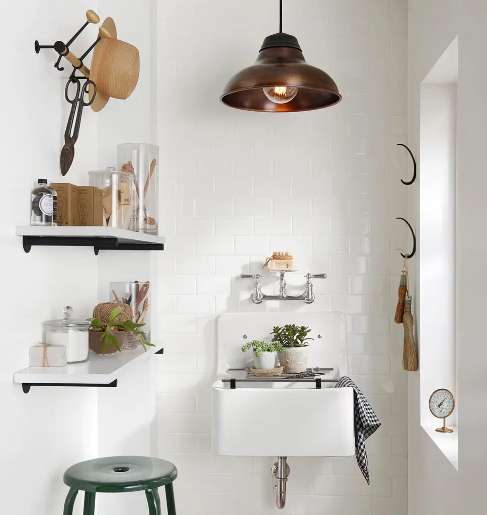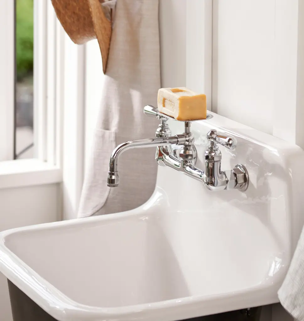 A classic soap dish sits in between two club-style handles on this timeless utility faucet. Upgrade any bathroom, laundry room, or utility space with this quality fixture, featuring durable ceramic cartridges and solid brass construction. Details You'll Appreciate Classic soap dish and two club-style handles Timeless, vintage-inspired design High-quality ceramic cartridges and durable solid brass construction Product Specifications Solid brass with durable chrome plated finish WaterSense - 1.5gpm (meets EPA guidelines) 1/4 turn quality ceramic cartridges and 6" swivel spout Assembled in the USA of domestic and imported parts