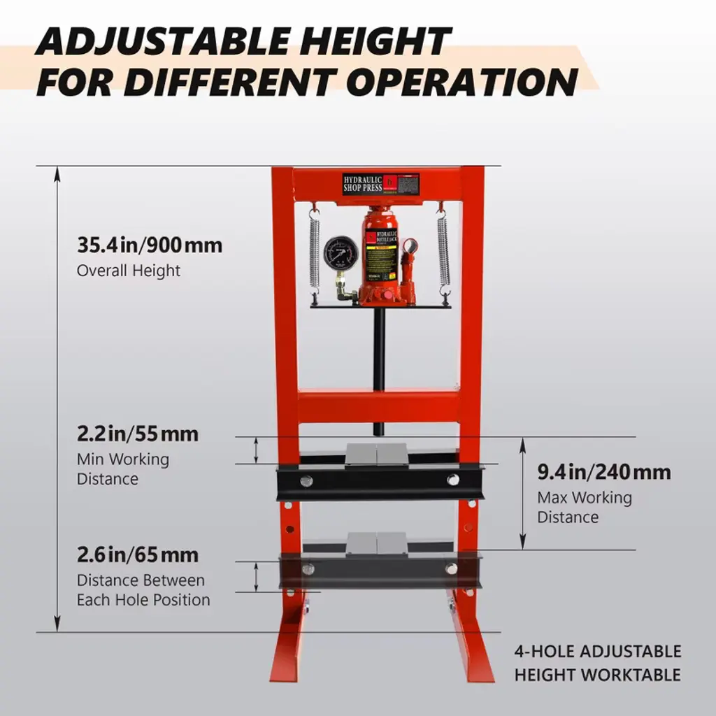Product Name: 6 Ton Hydraulic Shop Press, Heavy-Duty H-Frame Bearing Press with Stamping Plates & Pressure Gauge, Adjustable Worktable for Metal Bending, Straightening, Installing Bearings & U-Joints – Garage Floor Press Tool Main Material:Steel Rated Load: 6 ton (with pressure gauge) Product Dimensions Assembled Length (in.):19.69 Assembled Width (in.):19.69 Assembled Height (in.):35.43 Weight (lbs.):50.71