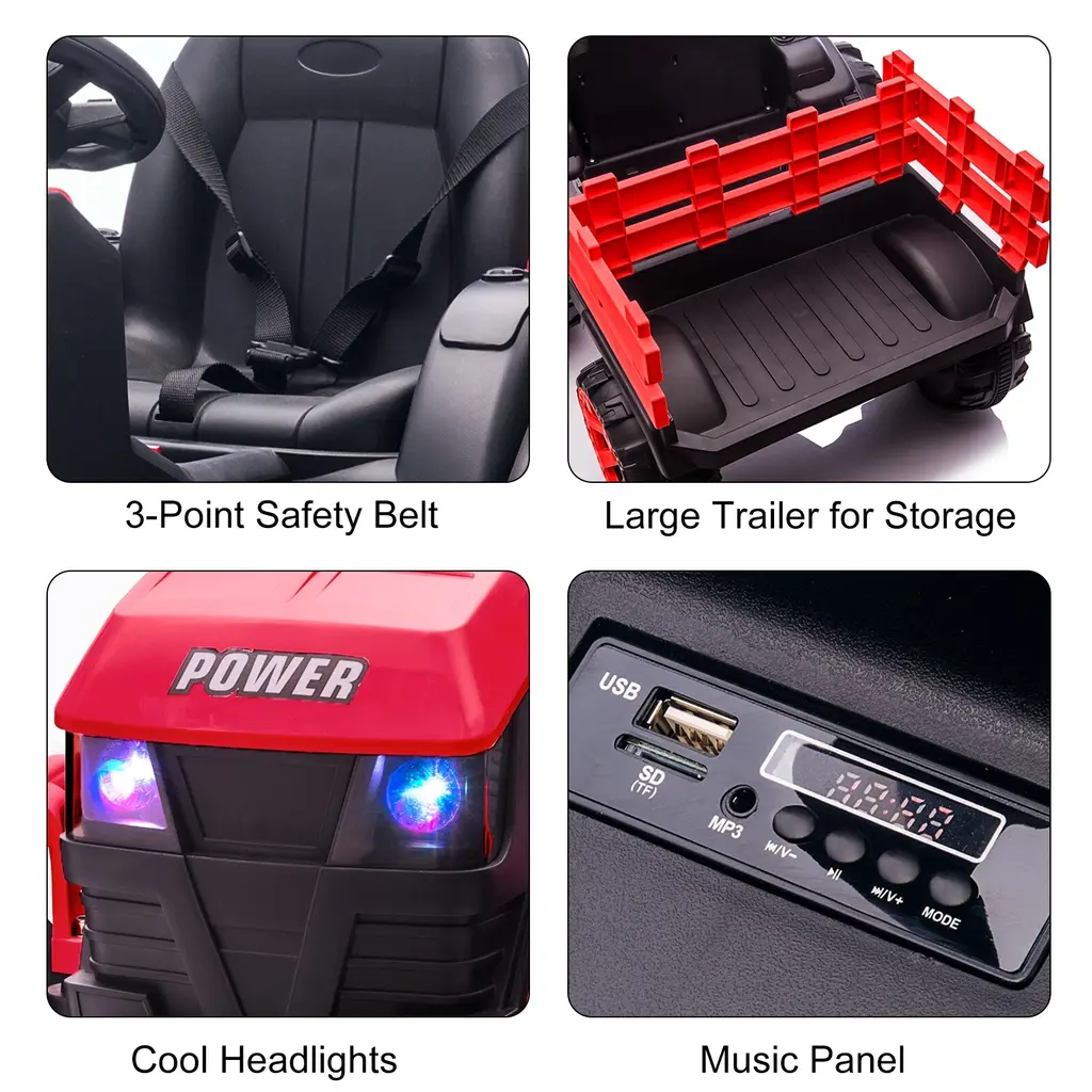 【Robust Ride-On Tractor Design】This ride-on toy is designed to resemble a real tractor, complete with a detachable trailer for hauling toys, supplies, or even friends. The realistic design and vibrant color options—pink, red, black, yellow, and green—make it appealing to both boys and girls.【Remote Control Functionality】For added safety and ease of use, this ride-on tractor includes a remote control that allows parents to take charge. This feature is perfect for younger children or those who may need help navigating their surroundings.【Sturdy 6-Wheel Design】With a 6-wheel construction, this tractor offers enhanced stability and balance, allowing it to travel over uneven surfaces with ease. The robust design ensures durability for long-lasting fun.【35W Dual Motors】The tractor features 35W dual motors that deliver impressive power and traction. This ensures smooth rides on grass, dirt, and pavement, making it suitable for outdoor play in various environments.【Perfect Gift for Any Occasion】Whether it's for a birthday, Christmas, or any special occasion, this ride-on tractor is sure to be a hit with kids. It promotes outdoor play and physical activity while providing a fun and engaging way to learn about vehicles.