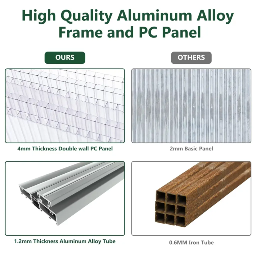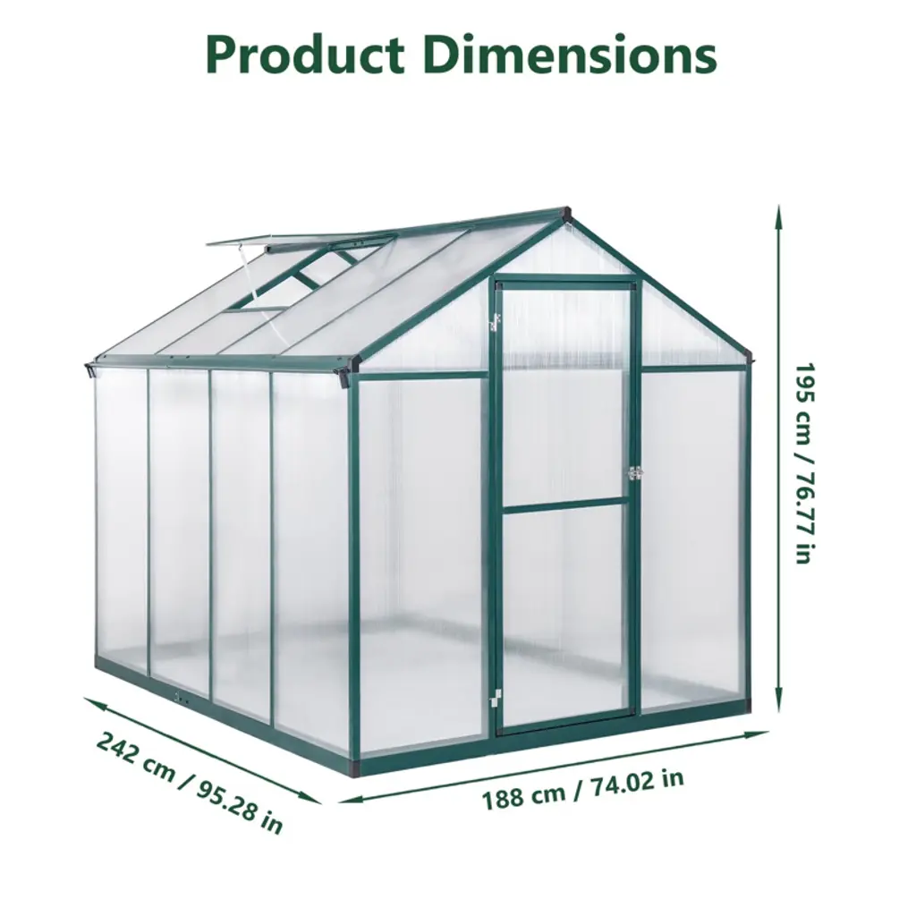 6x8x6.5 ft walk-in greenhouse features a robust 1.2mm thick aluminum alloy frame paired with 2mm double polycarbonate panels for superior insulation. It absorbs sunlight in winter and blocks solar radiation in summer, providing an ideal environment for plant growth. The integrated rainwater collection system channels water into gutters for sustainable irrigation. Adjustable roof vent windows allow precise airflow control, while lockable doors provide security. Versatile for use as a plant greenhouse, sunroom, or outdoor canopy, it offers easy assembly with labeled parts and clear instructions. Dimensions: Length: 8 feet Width: 6 feet Height: 6.5 feet Frame Material: 1.2mm aluminum alloy Panel Material: 2mm double polycarbonate What You Get: One 6x8 ft polycarbonate greenhouse with lockable doors and adjustable vent windows Integrated rainwater gutter system Assembly hardware and step-by-step instruction manual After-Sales Service: We provide detailed assembly guides and responsive customer support to ensure hassle-free installation and assistance with any questions or concerns for a rewarding gardening experience.