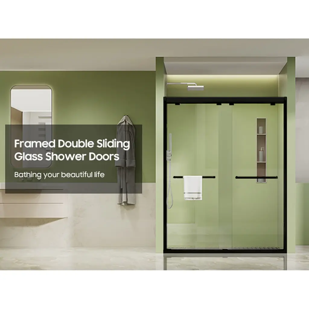 The MESA Aluminum frame Shower Door offers a sleek and modern design, elevating the look of any bathroom. The clear tempered glass provides a spacious and open feel, while the stainless steel hardware and support bar adds a touch of elegance.The clear tempered glass is 1/4" thick. The glass is also coated with a Nano Technology protective layer, making it easy to clean and resistant to stains and scratches. The stainless steel hardware is made of high-quality materials and is corrosion-resistant, ensuring long-lasting durability.The shower door is designed for easy installation with the help of a professional plumber. The door can move on Both sides.