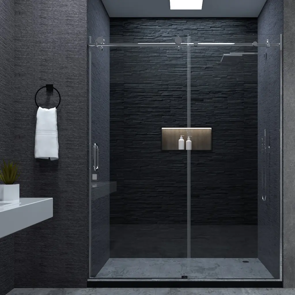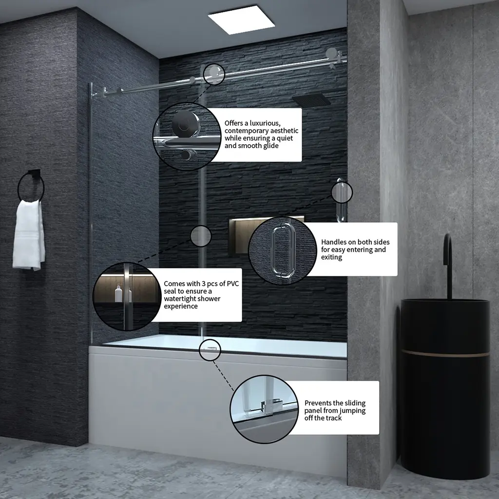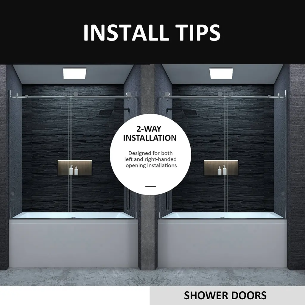 Elevate your bathroom with our sleek and functional frameless sliding alcove tub door. Designed to fit openings between 58 in. and 60 in. wide with a height of 60 in., this door features two bypass sliding panels that offer a convenient 24 in. to 26 in. walk-through width. Crafted from premium 1/4 in. (6 mm) ANSI certified clear tempered glass, it ensures durability and safety. The chrome anodized aluminum hardware and stainless-steel rollers are built to resist corrosion and rust, while the easy glide hidden roller system provides smooth operation. With flexible width adjustment and reversible installation for left- or right-hand door opening, it fits your space perfectly. Full-length side bars, top rail, and bottom tracks deliver a watertight seal to prevent leaks, and detailed installation instructions and hardware are included for a hassle-free setup.[Clear Glass Finish]The clear finish is easy to clean and stain-resistant, and the unique appearance makes your room more fashionable and futuristic.[Scratch & Tarnish Resistant]The hardware is finished in chrome, build to resist daily scratches & tarnish. The chrome surface for a modern appearance complements most decorating styles.[Frameless]A frameless shower door can instantly make your bathroom look bigger and brighter, adding a fresh and modern feel yet having the versatility to compliment any bathroom style.[Unique Design]Our handles feature a unique design that adds a fresh new look to your shower door. You can easily open and close the door with the handle.[Quality Materials]This shower door is made using a metal frame that can withstand the weight and is resistant to damage, it will add to the beauty of your bathroom and is very functional.[Tempered Glass]Crafted with tempered glass the shower door is heavy-duty and durable enough to provide long-lasting use.[Tub door]A bathtub shower door can instantly make your bathroom look bigger and brighter, adding a fresh and modern feel yet having the versatility to compliment any bathroom style.