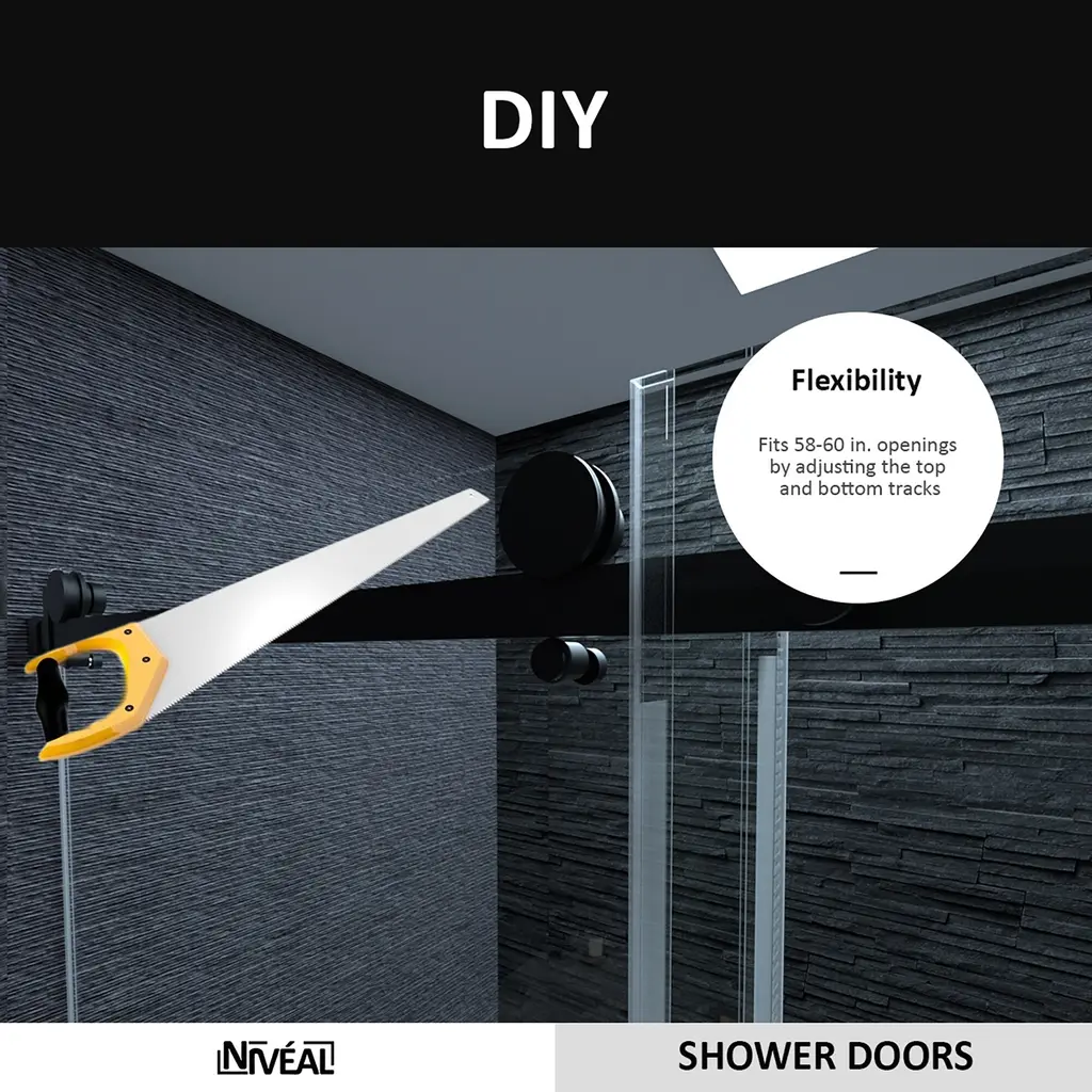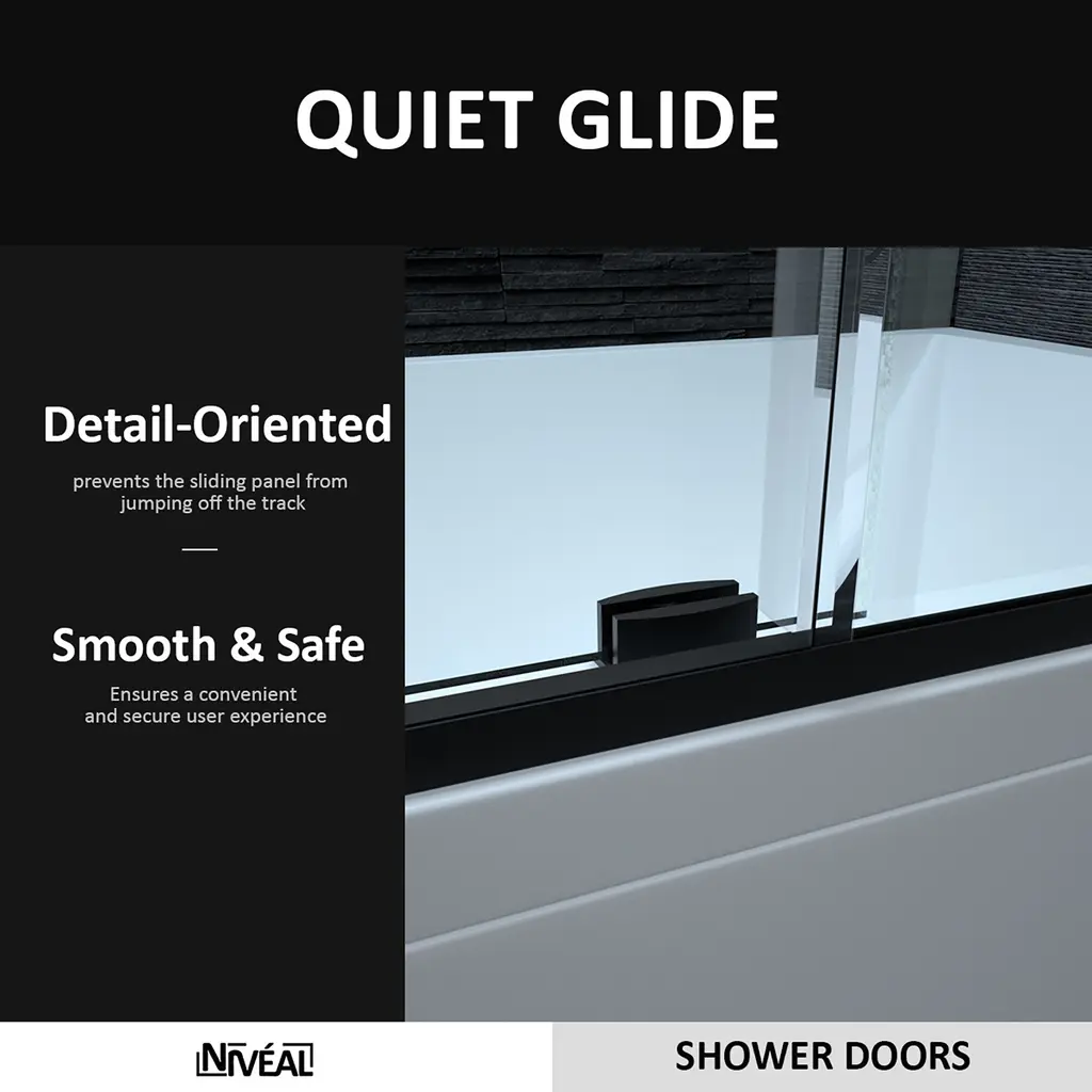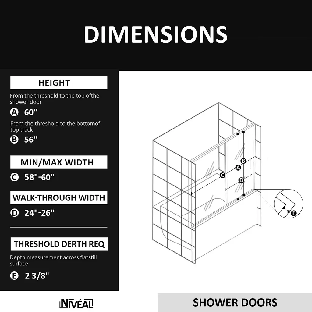 Elevate your bathroom with our sleek and functional frameless sliding alcove tub door. Designed to fit openings between 58 in. and 60 in. wide with a height of 60 in., this door features two bypass sliding panels that offer a convenient 24 in. to 26 in. walk-through width. Crafted from premium 1/4 in. (6 mm) ANSI certified clear tempered glass, it ensures durability and safety. The chrome anodized aluminum hardware and stainless-steel rollers are built to resist corrosion and rust, while the easy glide hidden roller system provides smooth operation. With flexible width adjustment and reversible installation for left- or right-hand door opening, it fits your space perfectly. Full-length side bars, top rail, and bottom tracks deliver a watertight seal to prevent leaks, and detailed installation instructions and hardware are included for a hassle-free setup.[Clear Glass Finish]The clear finish is easy to clean and stain-resistant, and the unique appearance makes your room more fashionable and futuristic.[Scratch & Tarnish Resistant]The hardware is finished in chrome, build to resist daily scratches & tarnish. The chrome surface for a modern appearance complements most decorating styles.[Frameless]A frameless shower door can instantly make your bathroom look bigger and brighter, adding a fresh and modern feel yet having the versatility to compliment any bathroom style.[Unique Design]Our handles feature a unique design that adds a fresh new look to your shower door. You can easily open and close the door with the handle.[Quality Materials]This shower door is made using a metal frame that can withstand the weight and is resistant to damage, it will add to the beauty of your bathroom and is very functional.[Tempered Glass]Crafted with tempered glass the shower door is heavy-duty and durable enough to provide long-lasting use.[Tub door]A bathtub shower door can instantly make your bathroom look bigger and brighter, adding a fresh and modern feel yet having the versatility to compliment any bathroom style.