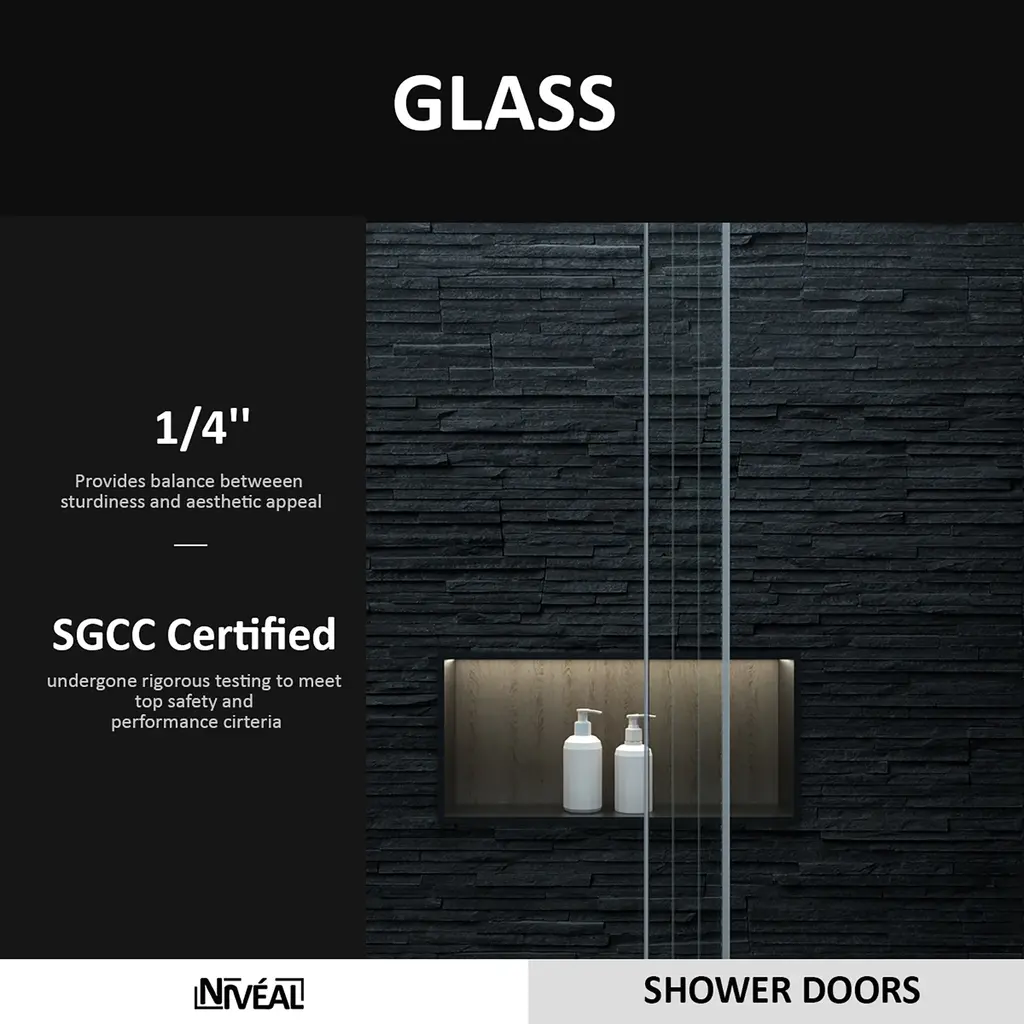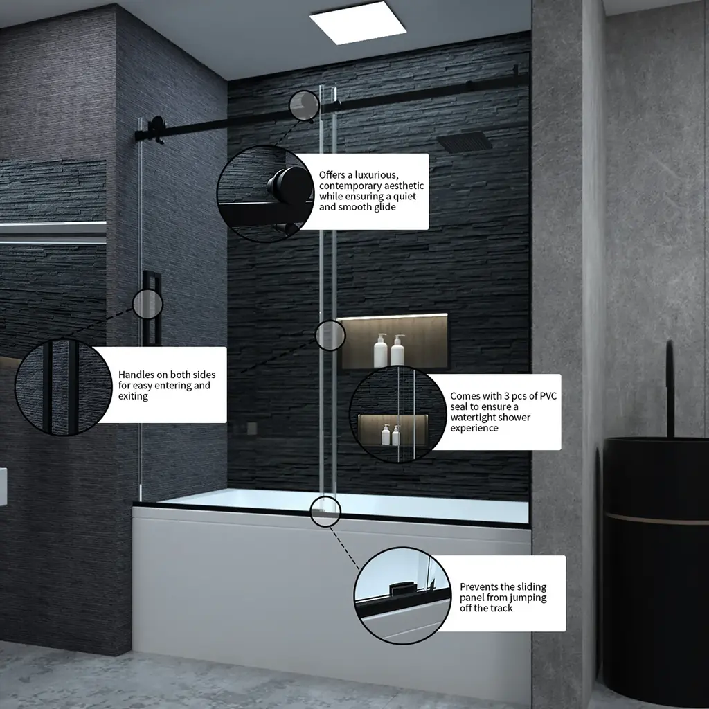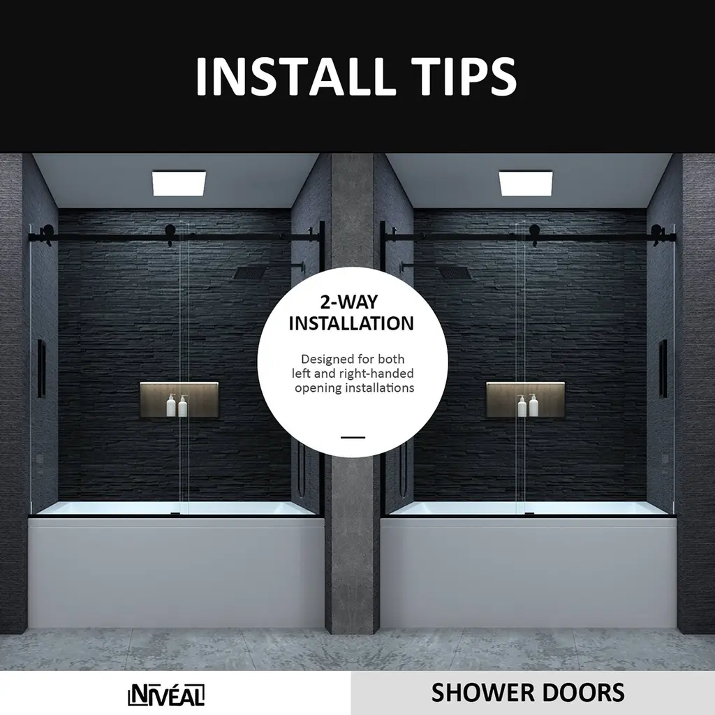 Elevate your bathroom with our sleek and functional frameless sliding alcove tub door. Designed to fit openings between 58 in. and 60 in. wide with a height of 60 in., this door features two bypass sliding panels that offer a convenient 24 in. to 26 in. walk-through width. Crafted from premium 1/4 in. (6 mm) ANSI certified clear tempered glass, it ensures durability and safety. The chrome anodized aluminum hardware and stainless-steel rollers are built to resist corrosion and rust, while the easy glide hidden roller system provides smooth operation. With flexible width adjustment and reversible installation for left- or right-hand door opening, it fits your space perfectly. Full-length side bars, top rail, and bottom tracks deliver a watertight seal to prevent leaks, and detailed installation instructions and hardware are included for a hassle-free setup.[Clear Glass Finish]The clear finish is easy to clean and stain-resistant, and the unique appearance makes your room more fashionable and futuristic.[Scratch & Tarnish Resistant]The hardware is finished in chrome, build to resist daily scratches & tarnish. The chrome surface for a modern appearance complements most decorating styles.[Frameless]A frameless shower door can instantly make your bathroom look bigger and brighter, adding a fresh and modern feel yet having the versatility to compliment any bathroom style.[Unique Design]Our handles feature a unique design that adds a fresh new look to your shower door. You can easily open and close the door with the handle.[Quality Materials]This shower door is made using a metal frame that can withstand the weight and is resistant to damage, it will add to the beauty of your bathroom and is very functional.[Tempered Glass]Crafted with tempered glass the shower door is heavy-duty and durable enough to provide long-lasting use.[Tub door]A bathtub shower door can instantly make your bathroom look bigger and brighter, adding a fresh and modern feel yet having the versatility to compliment any bathroom style.