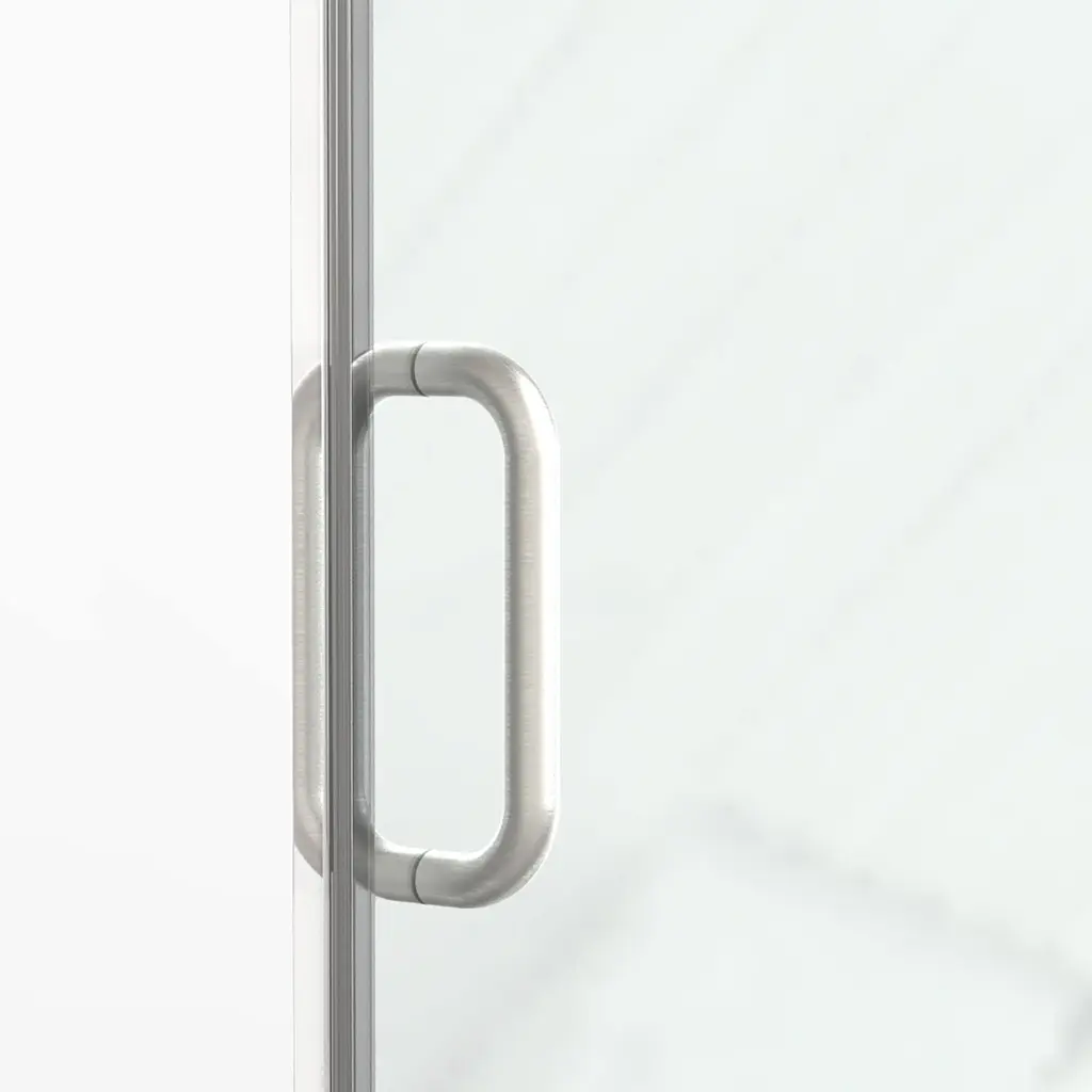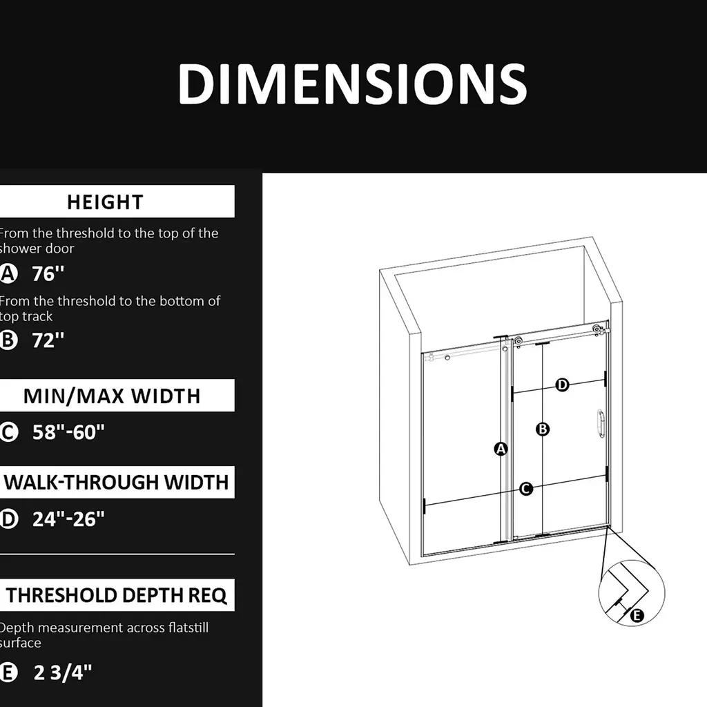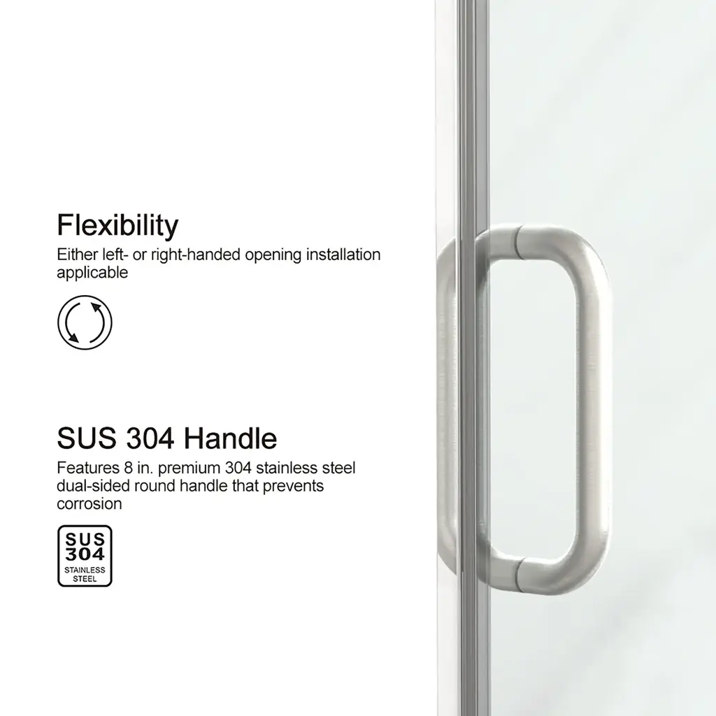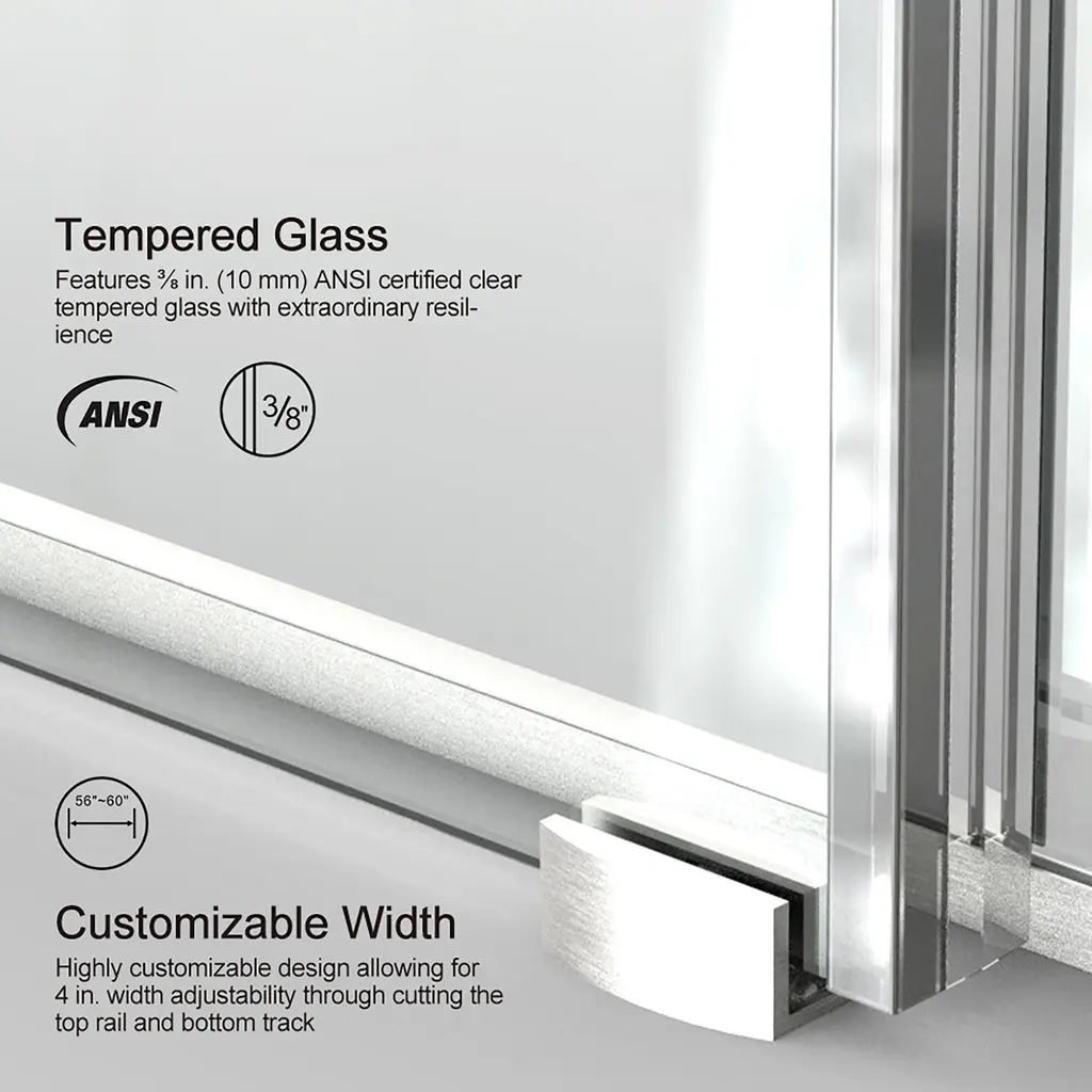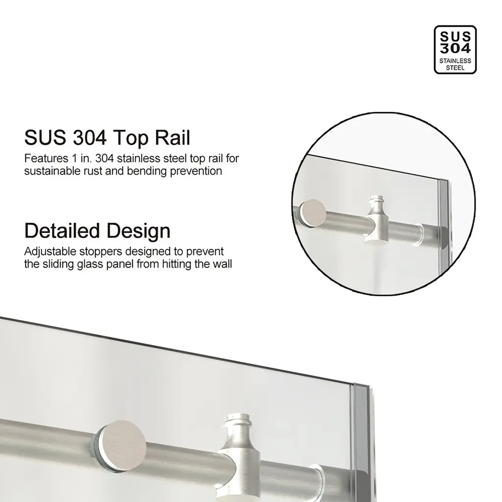 This shower door offers versatility with an adjustable width of up to 4 inches, easily customized by trimming the top bar and bottom track. Crafted with 8mm (5/16 in.) ANSI certified clear tempered glass, it ensures durability and safety. The 2-wheel roller system, paired with a round top bar, provides a smooth and effortless sliding experience, enhancing both functionality and style in your bathroom.【[Quality Materials】This shower door is made using a metal frame that can withstand the weight and is resistant to damage, it will add to the beauty of your bathroom and is very functional.【Tempered Glass】Crafted with tempered glass the shower door is heavy-duty and durable enough to provide long-lasting use.【Shower Door】The stylish shower door makes your bathroom modernized. Enjoy your showers by creating a comfy privacy space. Keep your bathroom always tidy and clean.【Single Sliding】The single sliding shower door is everything you want with your bathroom remodel. It has built-in adjustability to ensure that it is a perfect fit in your shower. You can be easily cleaned and maintained by using a squeegee after each use.【Frameless】A frameless shower door can instantly make your bathroom look bigger and brighter, adding a fresh and modern feel yet having the versatility to compliment any bathroom style.【Unique Design】Our handles feature a unique design that adds a fresh new look to your shower door. You can easily open and close the door with the handle.【Clear Finish】Modern clear glass creates a beautiful finish that lets in light but also offers some privacy. It is the best choice for your bathroom.