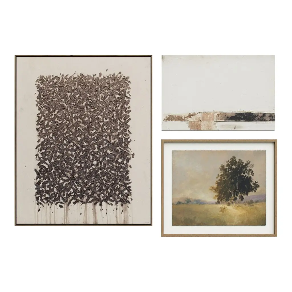 A complementary mix of pieces craft the look of a collected gallery wall. This three-piece set includes Tender Provisions by Tyler Guinn, We Woke to a Dream by Aileen Fitzgerald and Gneiss by Paul Meyer. Handmade in Austin, Texas.