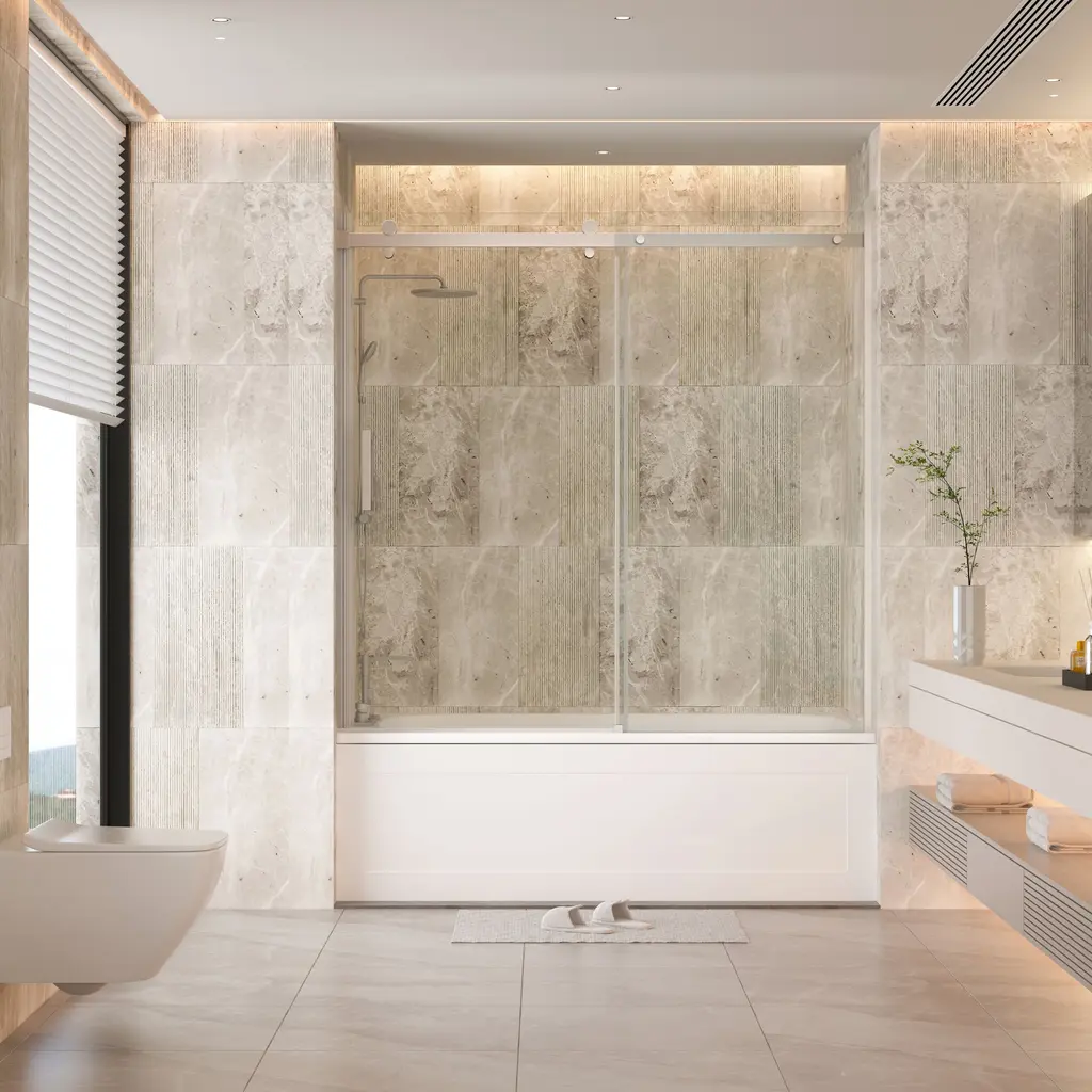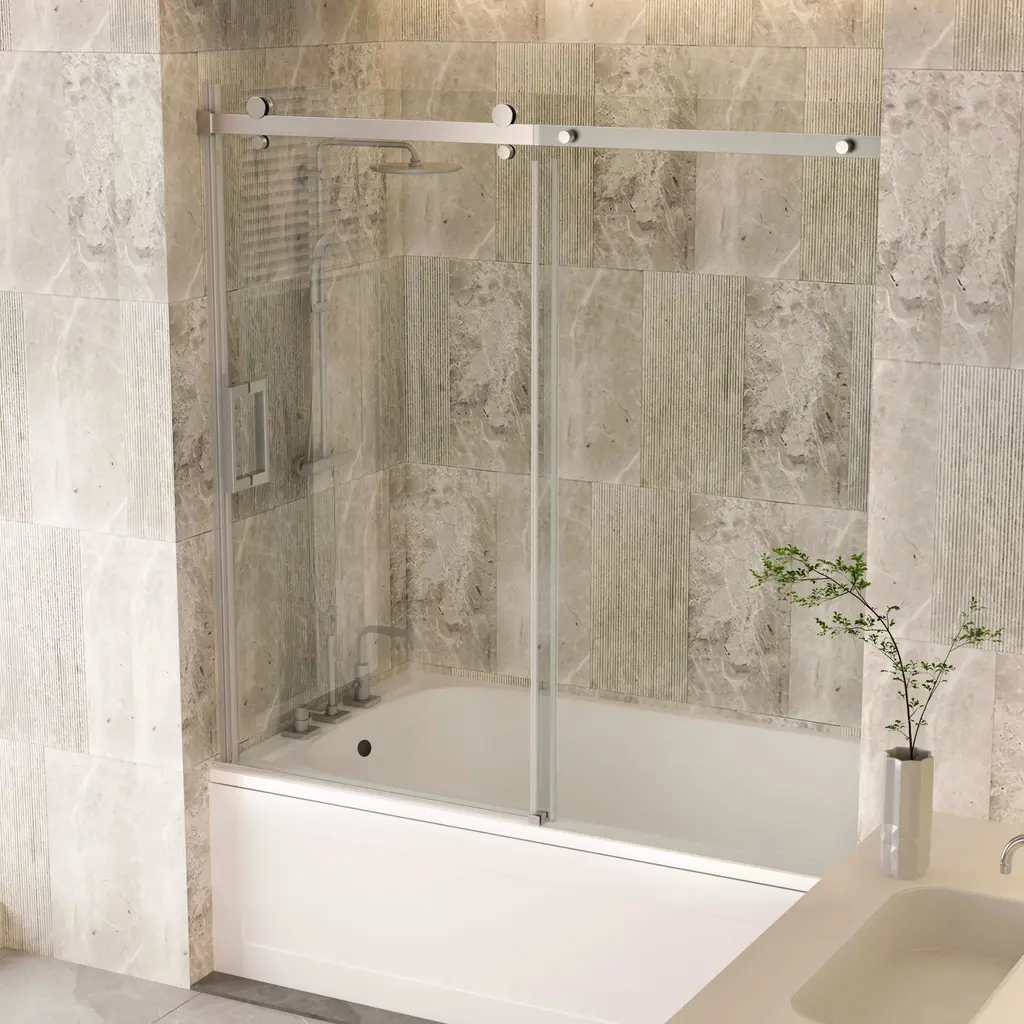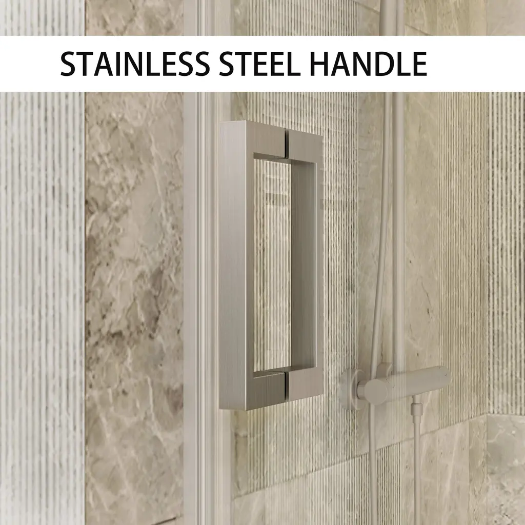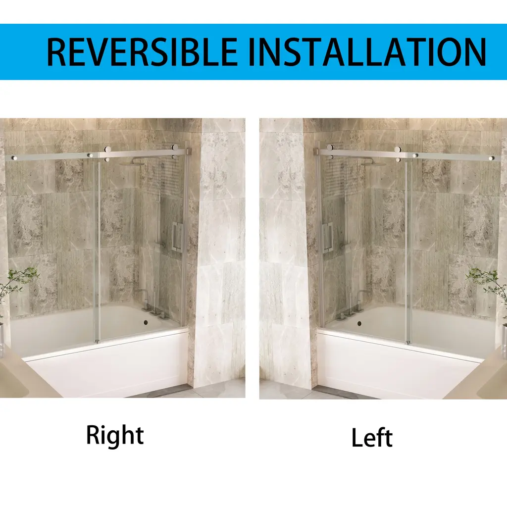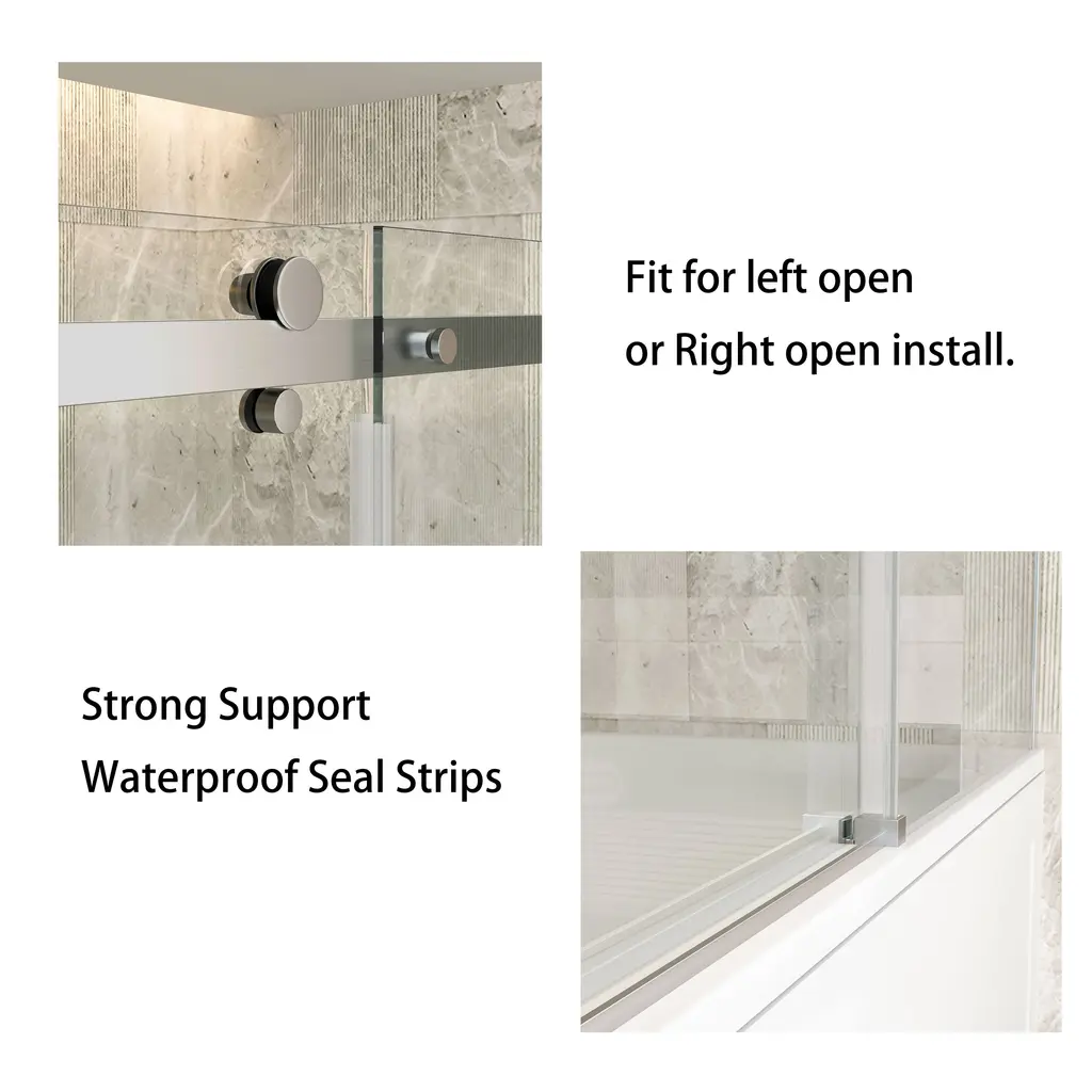Step into luxury with our exquisite shower door glass sliding 58''/74'' inches high. Crafted with precision and elegance, this sleek and modern design redefines your shower experience. With a frameless and tempered glass sliding door available in widths of 60'', it offers a generously spacious entrance to your shower haven. Immerse yourself in the beauty of unobstructed, crystal-clear glass, enhancing your bathroom's aesthetic while creating an open and airy ambiance. The durable construction ensures both reliability and safety, providing a secure enclosure for your daily indulgence.Size:Feature:Specifications: