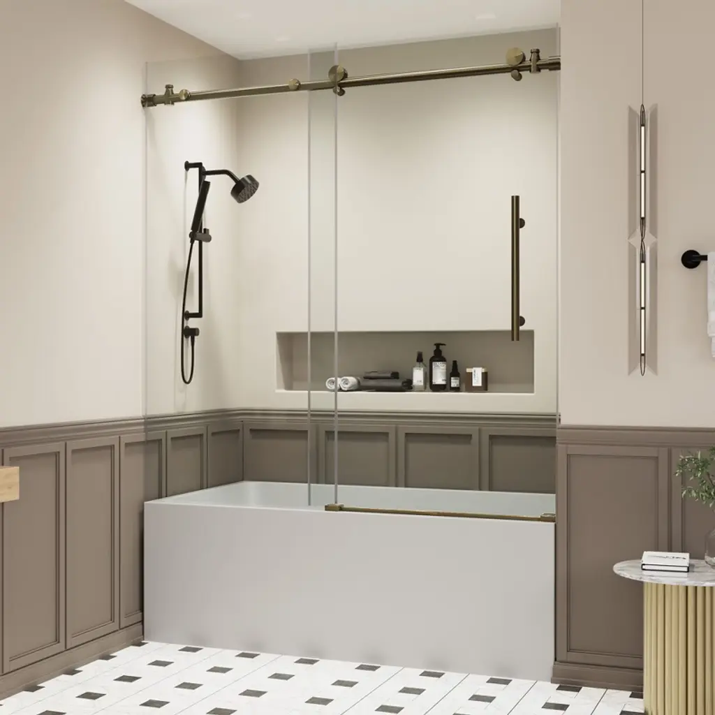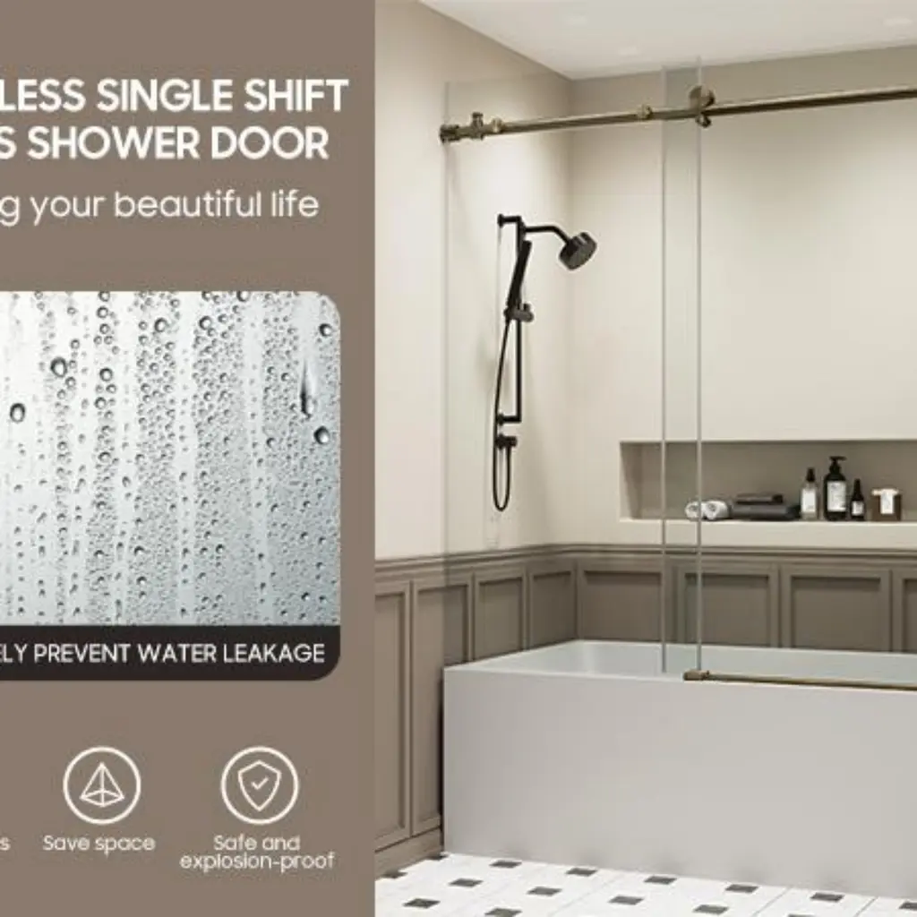 Experience the ultimate in luxury and functionality with our Frameless Sliding Glass Bathtub Door. This exquisite bathtub door measures 60" in width and 59" in height, making it a perfect fit for your bathroom space. Frameless Design: The sleek and modern frameless design of this sliding glass bathtub door adds a touch of elegance to your bathroom decor. High-Quality Materials: Crafted from premium stainless steel, the hardware of this bathtub door is durable, corrosion-resistant, and built to last. Clear Tempered Glass: The 5/16" (8mm) thick tempered glass used in this bathtub door ensures safety and durability, providing a crystal-clear view. Nanotechnology Coating: The glass is coated with a nanotechnology protective layer, enhancing its resistance to stains, water spots, and soap scum. Waterproof Seal Strip: This bathtub door comes with a waterproof seal strip to prevent any leakage or water seepage from the shower area.