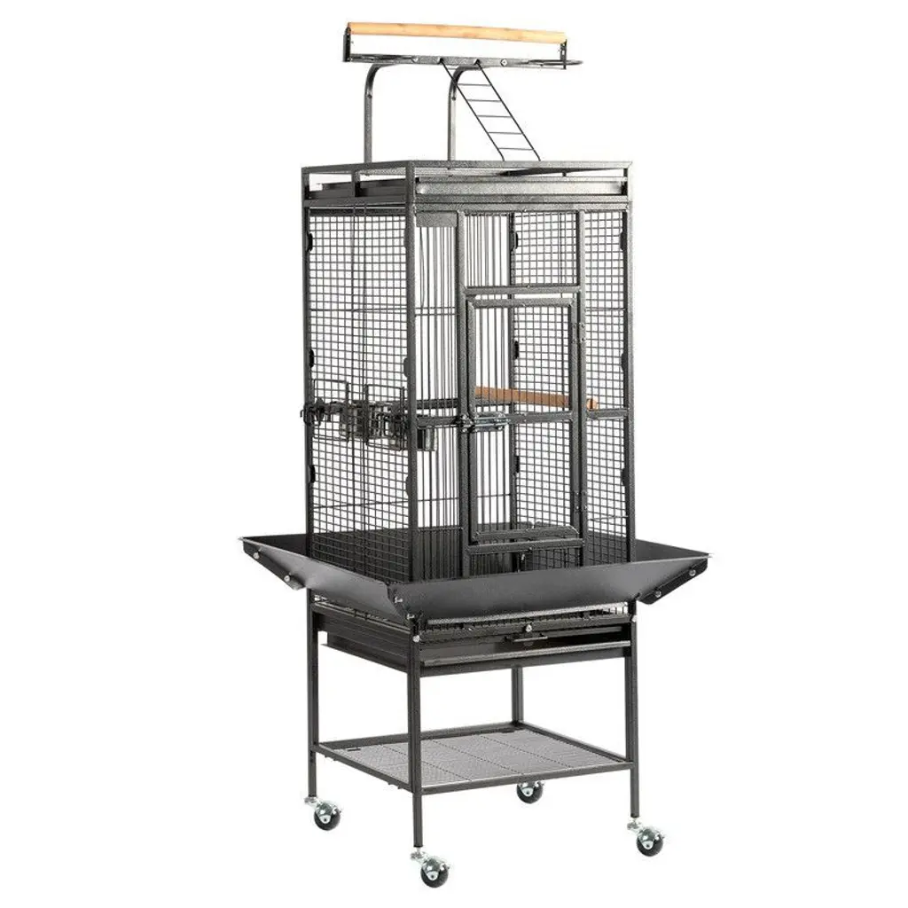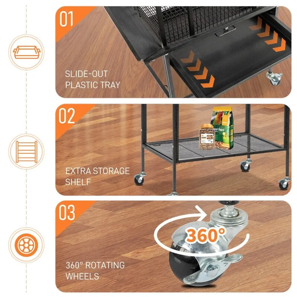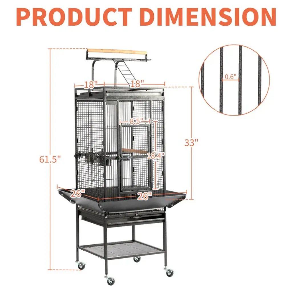 Interactive Play Top for Engaging Fun: Designed with a ladder, durable wooden perch, and two stainless steel feeders, the play top area keeps your birds entertained and encourages natural behaviors. Perfect for bonding time or independent play. Hassle-Free Cleaning & Tidy Space: Equipped with slide-out trays and safety metal grille to catch droppings, plus a seed guard to minimize mess. The double tray system makes cleaning quick and effortless, ensuring a hygienic environment for your birds. Spacious and Safe Interior: The roomy design accommodates multiple birds, allowing them to stretch, perch, and play comfortably. The secure latch on the main door provides peace of mind, keeping your pets safe while giving you easy access. Portable and Versatile Design: Smooth-rolling wheels allow for effortless mobility, making it easy to move indoors or outdoors. Whether you’re rearranging your home or enjoying a sunny day on the patio, this cage adapts to your lifestyle seamlessly.