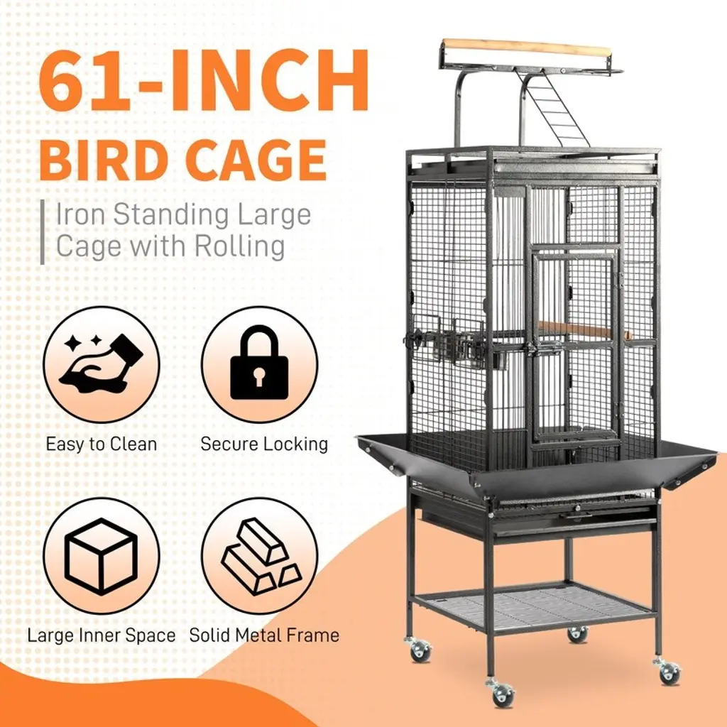 61 Inch Wrought Iron Large Rolling Bird Cage With Play Top And Stand For Parrots Lovebird Cockatiel Parakeets - Black