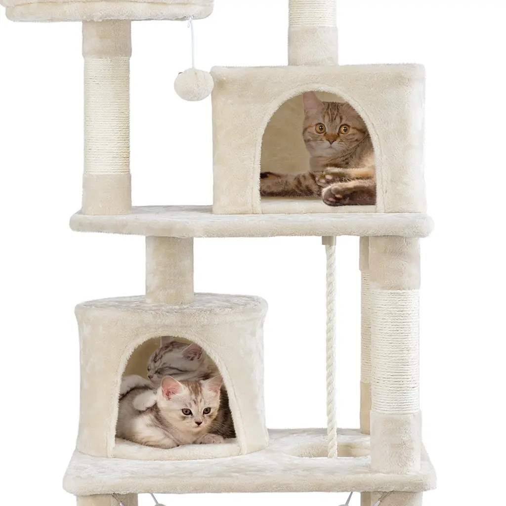 JOYFUL: Reinforced posts wrapped with natural sisal rope to encourage proper nail scratching and exercise. Two dangling balls with a bell help your cats get through the boring time when you're not at home. More, the cat condo hangs a thick rope for added excitement, and you can remove it if you do not want it SWEET & COZY: Two nicely-cushioned top perches with raised foam edges will be your cat's most frequently visited spots in the house, they can lounge leisurely while "surveying their kingdom". The two fluffy roomy condos and the soft hammock offer multiple cozy lounges and hideaways for your cautious furry friends STURDY AND STABLE CONSTRUCTION: Strengthened particle boards with battens at the bottom to ensure overall stability,and anti-toppling fittings are included for double security REPLACEABLE FUR TOYS: The cat condo hangs two furballs, which will add extra fun for your furry cats. You can replace them with your cats' favorite toys if needed CAREFULLY-SELECTED MATERIALS: Aiming at providing both your pets and you with a nice living environment, our cat tree is constructed of CARB P2-compliant particle board, natural sisal, and soft plush fabric covering