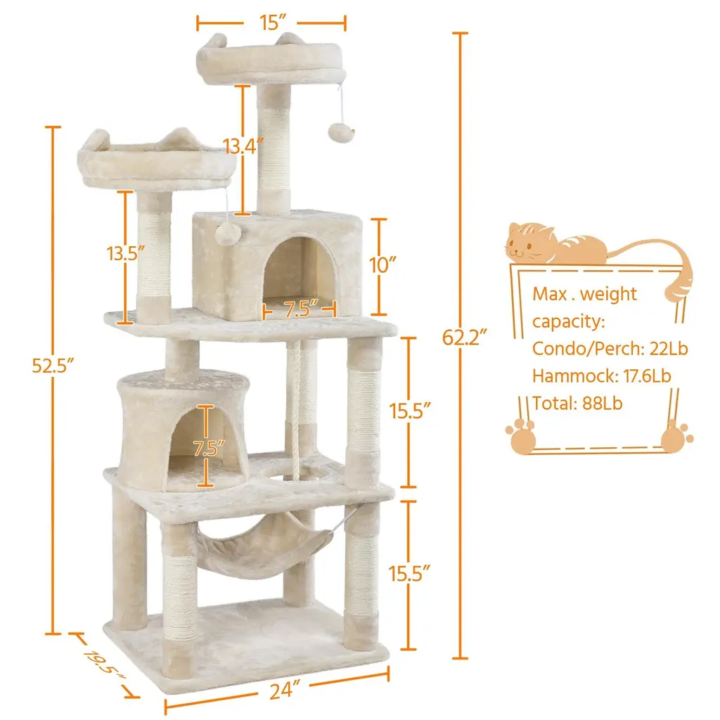 62.2" Cat Tree Cat Tower Cat Condo With Platform & Hammock, Scratching Posts For Kittens Pet Play House With Plush Perch - Beige