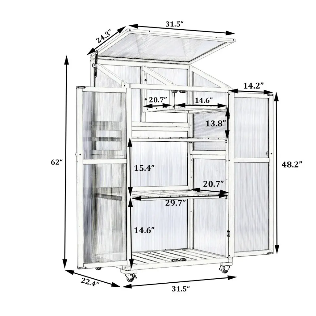 [Balcony Wood Greenhouse] This mini greenhouse is made of fir wood and polycarbonate panels. Compared with other wood cold frame, this one is larger and higher which the size is up to 31.5x22.4x62inch(LXWXH)so that you can have more plants without taking up so much places in your balcony. [Portable Cold Frame] Different with usual ones, this cold frame is designed with 4 wheels, 2 of them with brakes.No matter garden or backyard, it is convenient enough to put it in any places. The wheels also can be removed.For your safety, there is an anti-tipping strap. Just contact the device with wall to avoid falling as much as possible. [Adjustable Flower Organizer] There are 3-tier shelves inside the frame, 2 removable design and 1 half-shelf design. 6 levels in total for different plants height. 5.5inch between each level. The special half-shelf design will be suitable for higher flowers. Openable roof will provide better ventilation by adjusting the screws in different positions. [Assembly&Care] All of the products come with marked parts and necessary hardware. Simple assembly is required.To maximize the lifetime of your set, we recommend dusting frequently and cover it when not in use. [Dimension] Overall size:31.5x22.4x62inch(LXWXH). For more dimensions, please refer to the size image.Please feel free to contact us if any issues.
