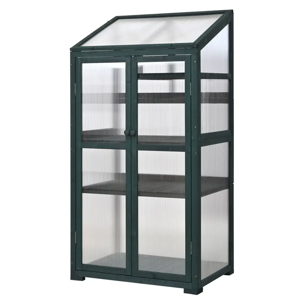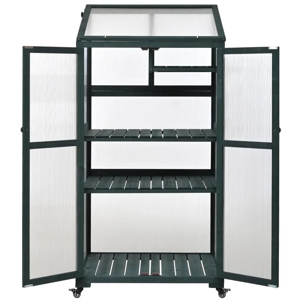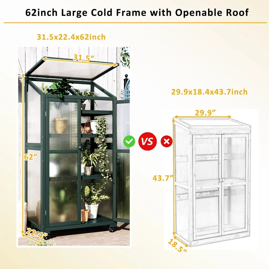 62'' Green Wood Greenhouse Balcony Portable Cold Frame With Wheels And Adjustable Shelves - Wood - Portable