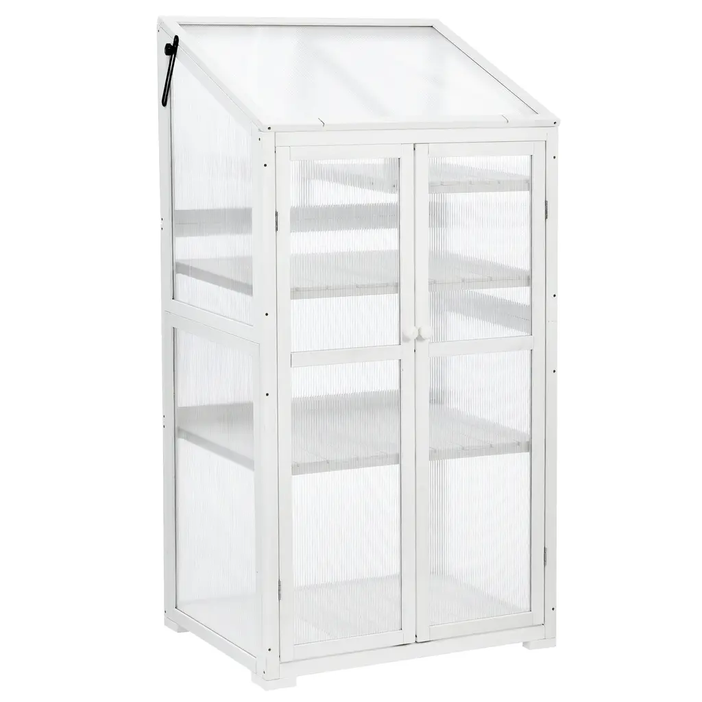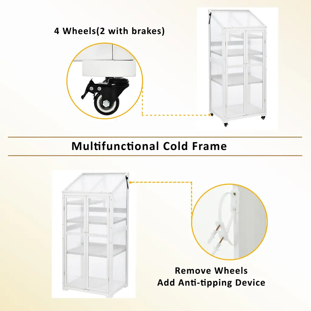 Spacious and Functional: Our mini greenhouse, constructed from fir wood and polycarbonate panels, provides a generous amount of space for plants while conserving balcony area, measuring 31.5x22.4x62 inches (LxWxH).Portable and User-Friendly: Featuring 4 wheels, including 2 with brakes for stability, this cold frame can be effortlessly moved around your garden or backyard. For safety, an anti-tipping strap is included, and the wheels can be easily detached.Adjustable Plant Display: The greenhouse boasts a 3-tier shelf design, with 2 removable and 1 half-shelf configuration, offering 6 levels to accommodate plants of varying heights. The roof opens for improved ventilation.Simple Assembly and Care: With clearly labeled parts and all necessary hardware included, assembling the greenhouse is a straightforward process. Regular dusting and covering when not in use will help prolong its lifespan.Dimensions and Customer Support: The greenhouse measures 31.5x22.4x62 inches (LXWXH), with additional dimensions provided in the size image. Customers are encouraged to contact us with any concerns or queries they may have.Description:Name: 3-tier greenhouseMain Material: RubberwoodFiller: WoodColor: Black/WhiteUse Case: Garden & OutdoorOverall size: 31.5x22.4x62inch(LXWXH), 44.7lbsUpper Shelf: 14.6x20.7inch(LXW)Middle/Lower Shelf: 29.7x20.7inch(LXW)Upper Shelf Weight Capacity: 40lbsMiddle/Lower Shelf Weight Capacity: 80lbsAssembly Required: YesNumber of packages: 1Package Size: 54.53x25.98x10.63inPackage Weight: 48.77lbsPacking list:1x cold frame4x wheels1x anti-tipping device