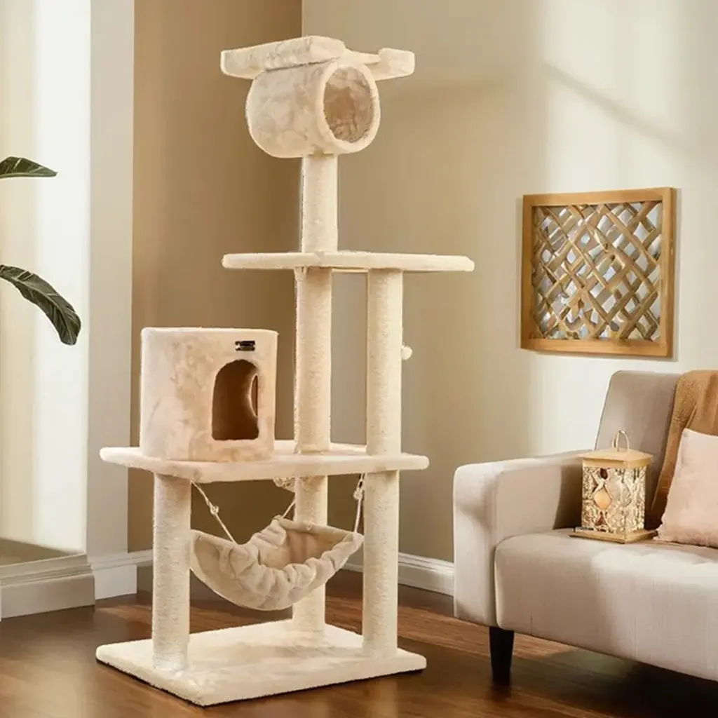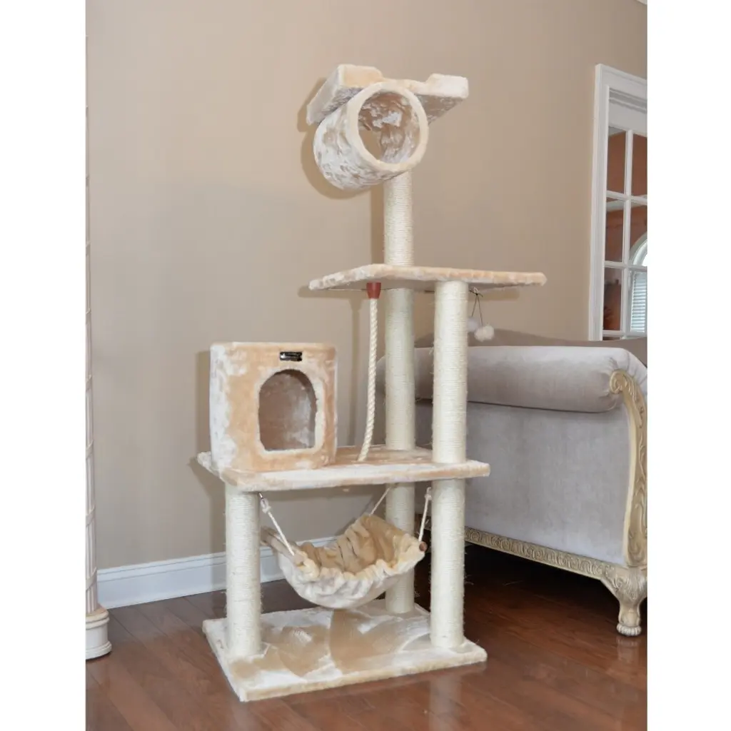 62" Real Wood Cat Tree With Scratch Posts, Hammock - Beige - Beige