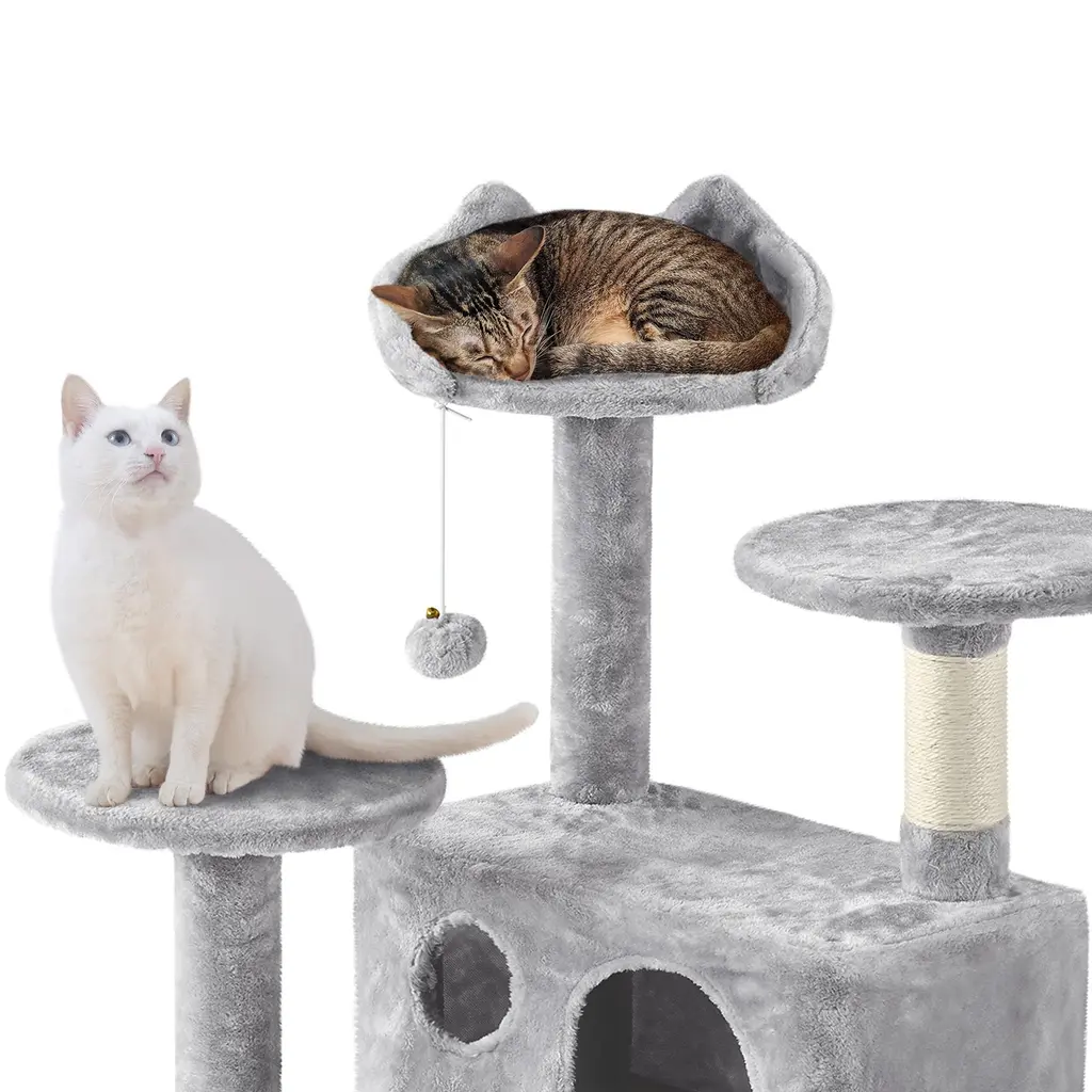 MULTILEVEL CAT HOUSE: This multiple-level cat tree has multiple tiers and structures for cats to play and sleep. It is suitable for around three small cats or two normally-sized cats but not suitable for large-sized cats. No matter it is for fun or rest, this cat tower is an ideal choice PET-FRIENDLY MATERIALS: Made of CARB P2-compliant manufactured wood, covered by skin-friendly plush, and connected by metal accessories, our cat tower is designed to bring a safe and stable entertaining center for your little angels SCRATCHING POSTS: Cat scratchers can make cats satisfied and protect your furniture from their paws. Three posts covered by natural sisal ropes are perfect for scratching TOP PERCHES AND SISAL POSTS: The three top perches are the ideal observatories for cats to "survey their house." Three sisal rope coiled posts at different heights help encourage positive scratching behavior and keep those sharp little claws away from your fine furniture